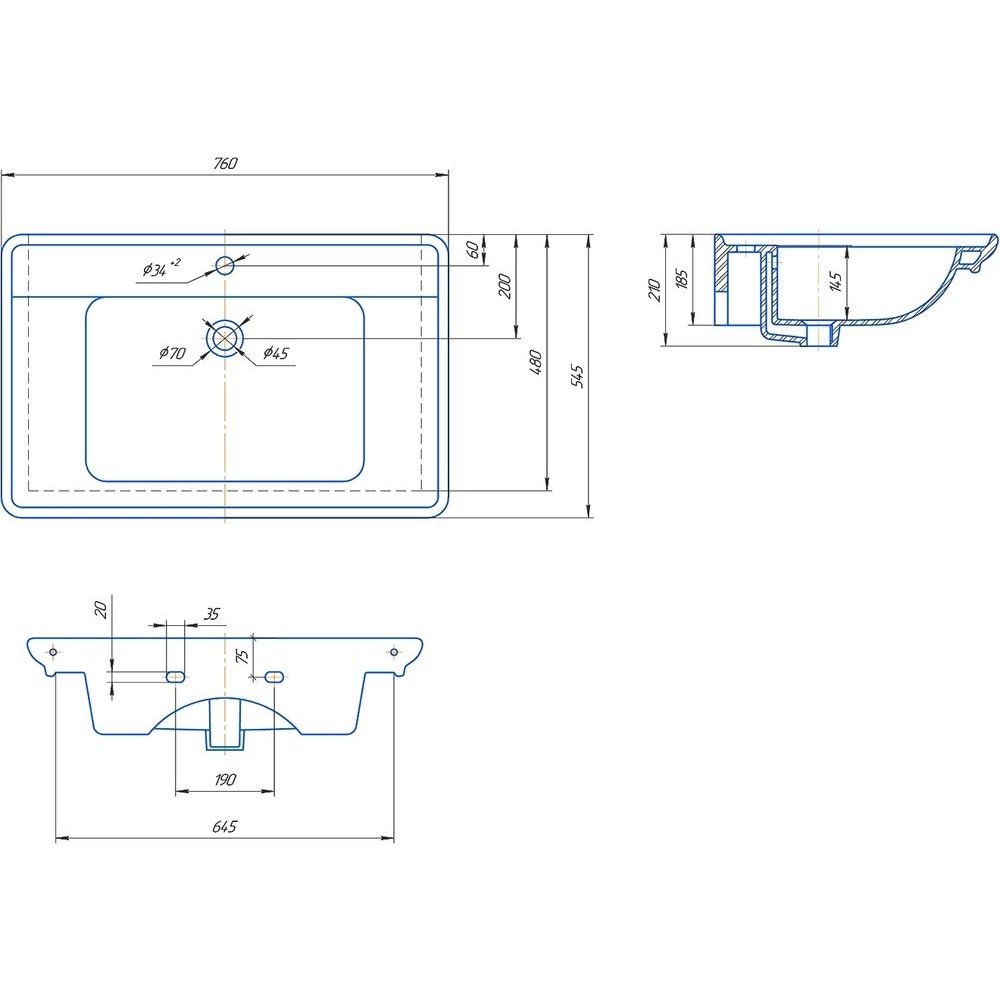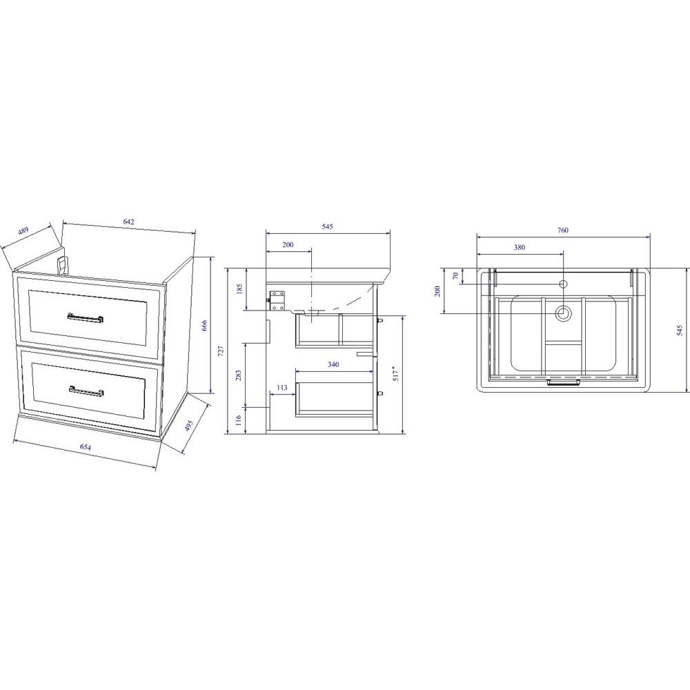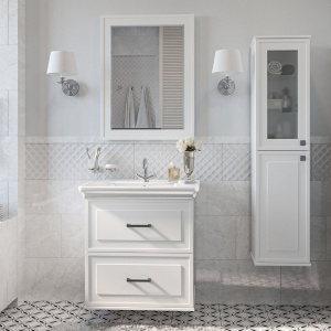 В комплект входят: подвесная тумба, размеры: 65,4x49,5x66,6 см, выполненная из ЛДСП с эмалированным покрытием и серой фурнитурой. Тумба оснащена ящиками с механизмом доводчика для плавного закрывания. Раковина Kirovit Дуглас 75 из фаянса имеет габариты 76x54,5 см, и оснащена встроенным сливом-переливом. Зеркало Sanflor Модена 75 с размерами 64x2x85 см также выполнено в белом цвете из ЛДСП с эмалью, имеет подвесное крепление.