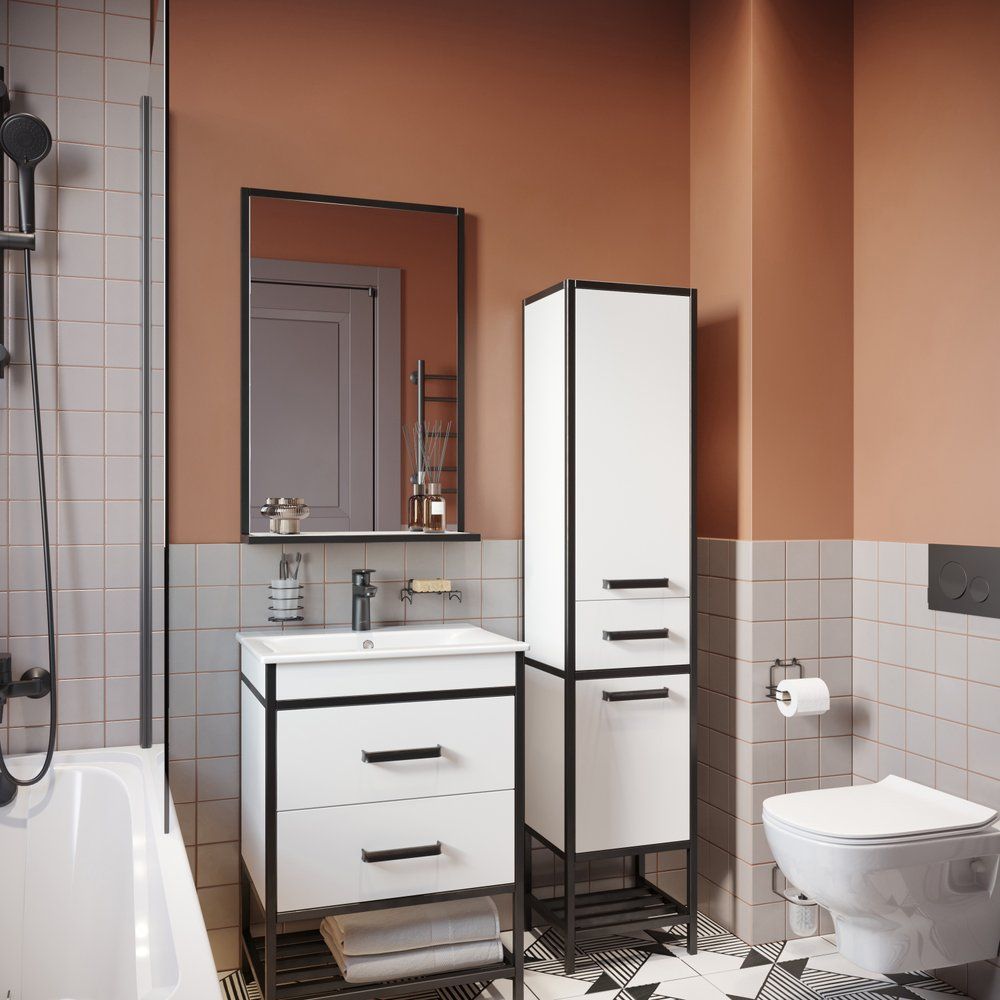 Тумба для комплекта Sanflor Норд 60 имеет размеры 55,8x43,4x80 см и выполнена в напольном исполнении. Конструкция из ЛДСП и металла с эмалевым покрытием обеспечивает долговечность и устойчивость. Чёрная фурнитура добавляет элегантности, а механизм доводчика гарантирует плавное закрывание. Гарнитур комплектуется ящиками и открытыми полками, а гарантия на тумбу составляет 2 года.