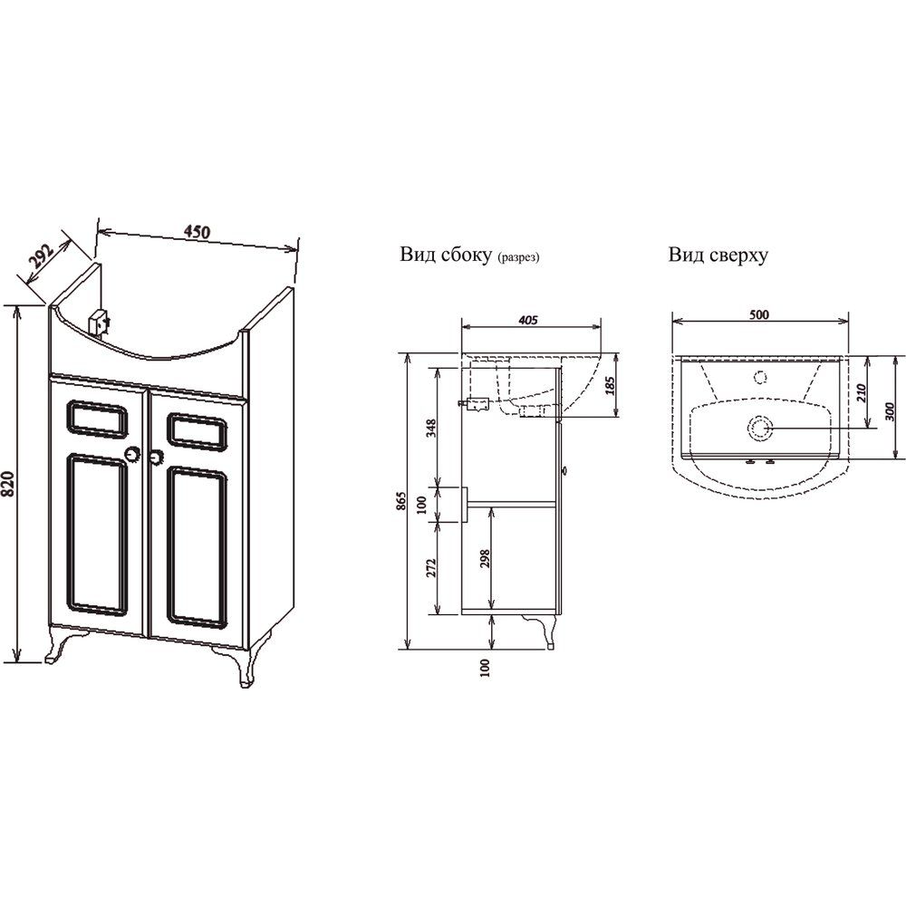 Гарнитур включает в себя тумбу, раковину и зеркало со следующими характеристиками: