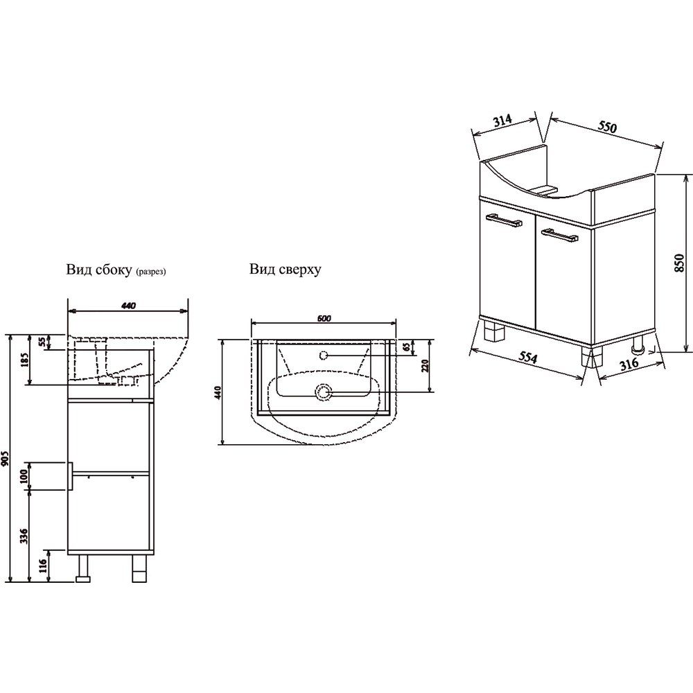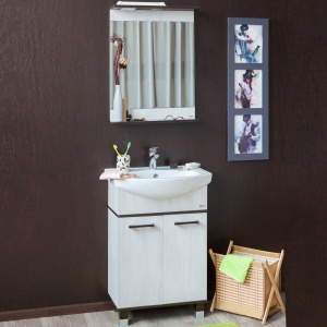 Мебельный комплект включает тумбу, изготовленную из ЛДСП с ламинатом, c габаритами 55,4x31,6x85 см. Она крепится к стене и дополнительно опирается на ножки, обеспечивая надежность и устойчивость. Дверки оснащены механизмом доводчика, для плавного закрывания, а съемные полки внутри предлагают гибкость в хранении.