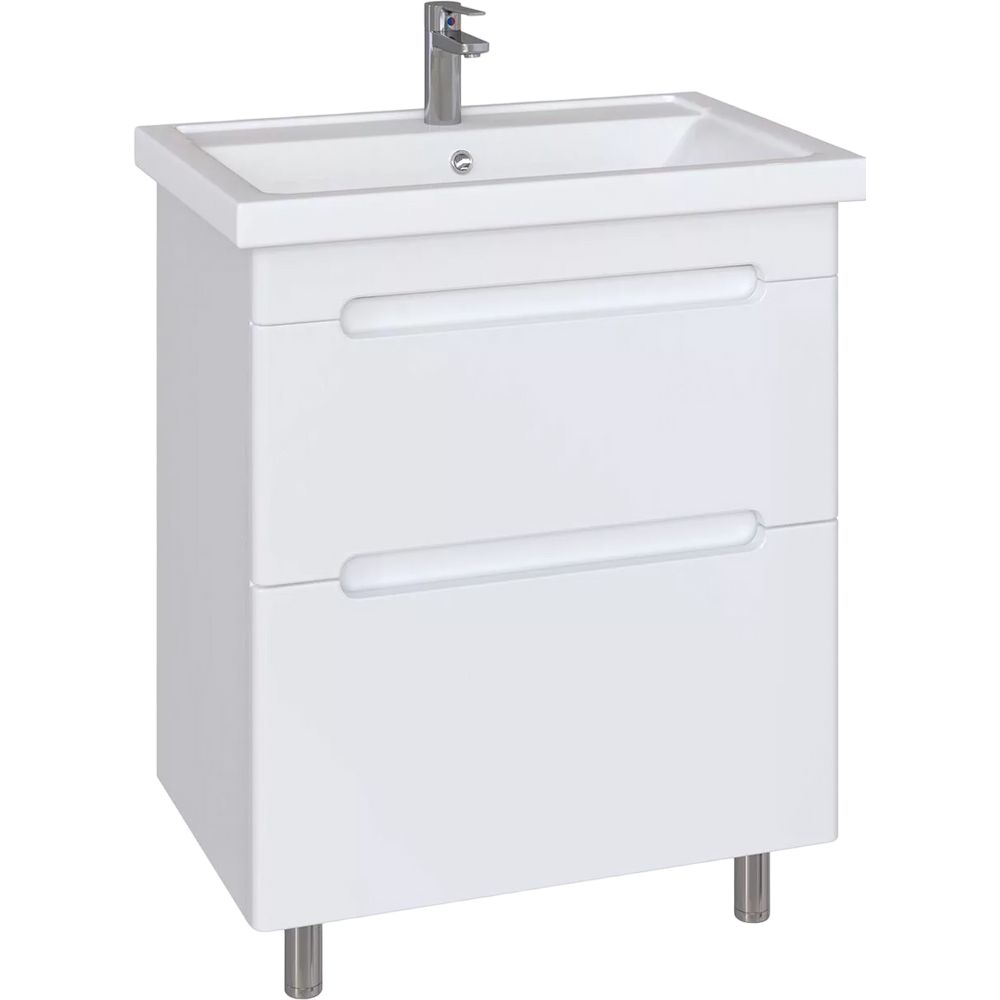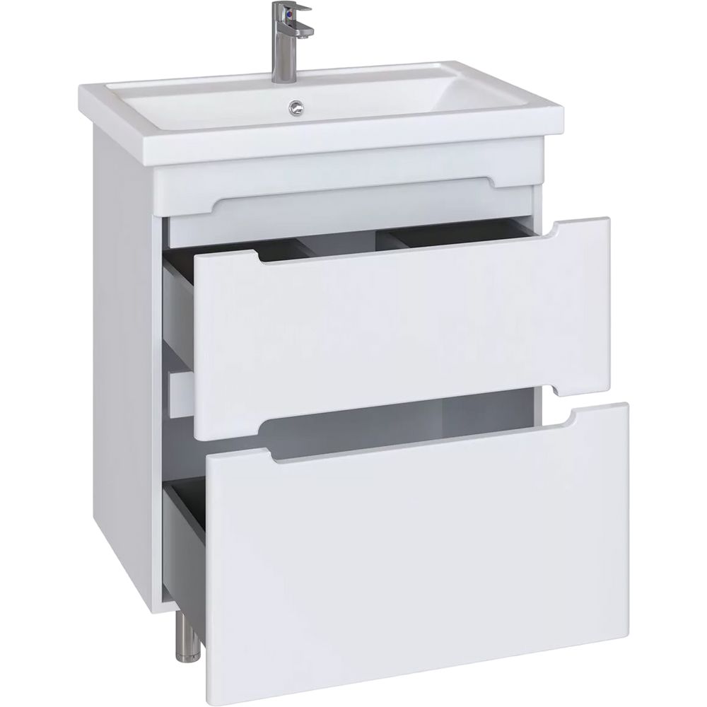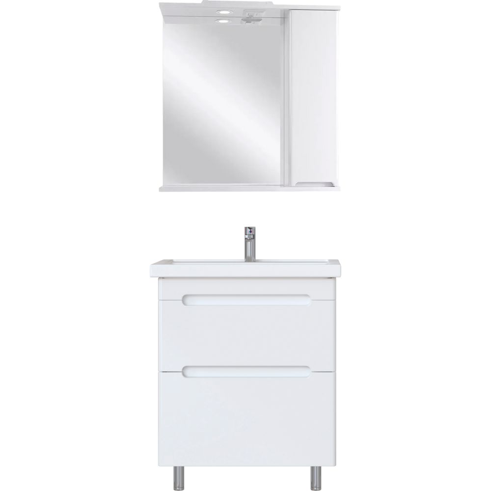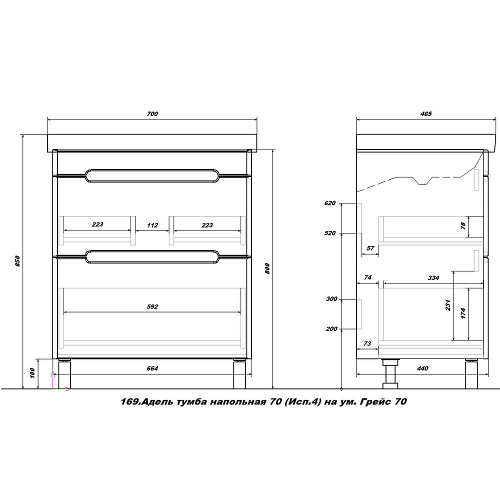 Комплект мебели включает напольную тумбу SanStar Адель 70, с габаритами 66,4x43,6x80 см, выполненную из ламинированного ЛДСП с МДФ фасадами, оснащёнными механизмами доводчика. Мебельная раковина Kirovit Фостер 70 из фаянса, подвесная, с встроенным слив-переливом, создана для сифона диаметром 3.2 см, имеет одно заранее подготовленное отверстие под смеситель, и требует отдельной покупки донного клапана. Зеркало SanStar Адель 70 снабжено электровыключателем и розеткой, размеры — 70,4x17,1x74,7 см. Все элементы гарнитура произведены в России и на них предоставляются различные гарантии.