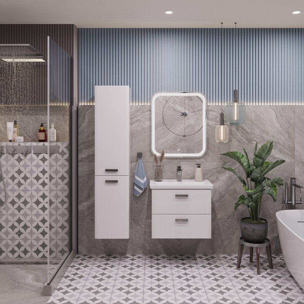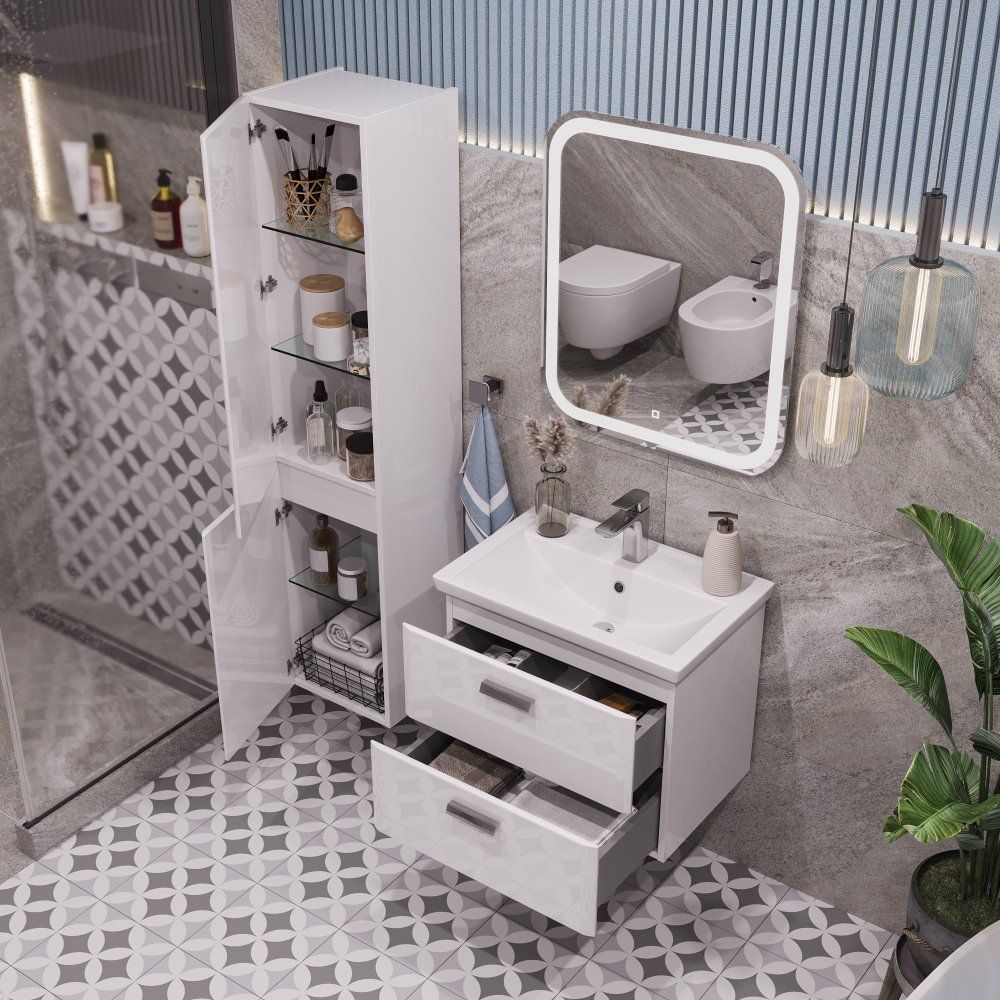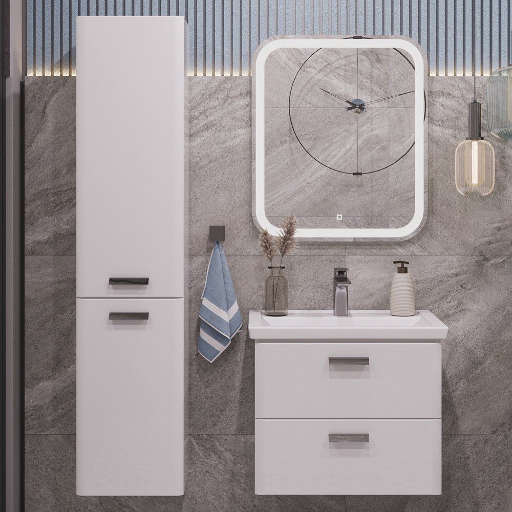 Комплект включает подвесную тумбу SanStar Gretta 60 с белым корпусом из ЛДСП и фасадами из МДФ, покрытыми эмалью. Габариты тумбы составляют 56,4x39,5x47 см, что делает ее компактной, но вместительной. Хромированная фурнитура добавляет изысканности. Все ящики оснащены механизмом доводчика для плавного закрывания.
