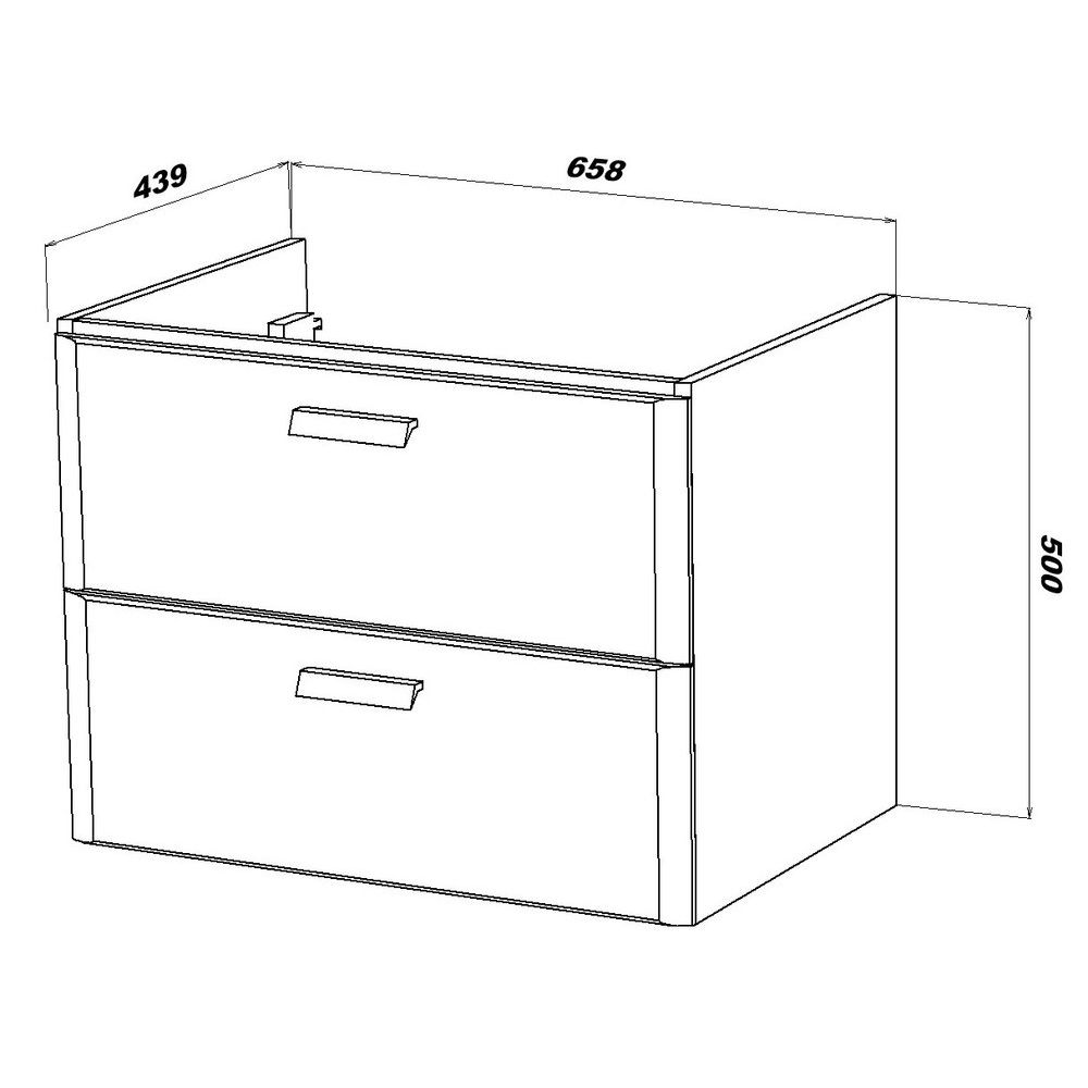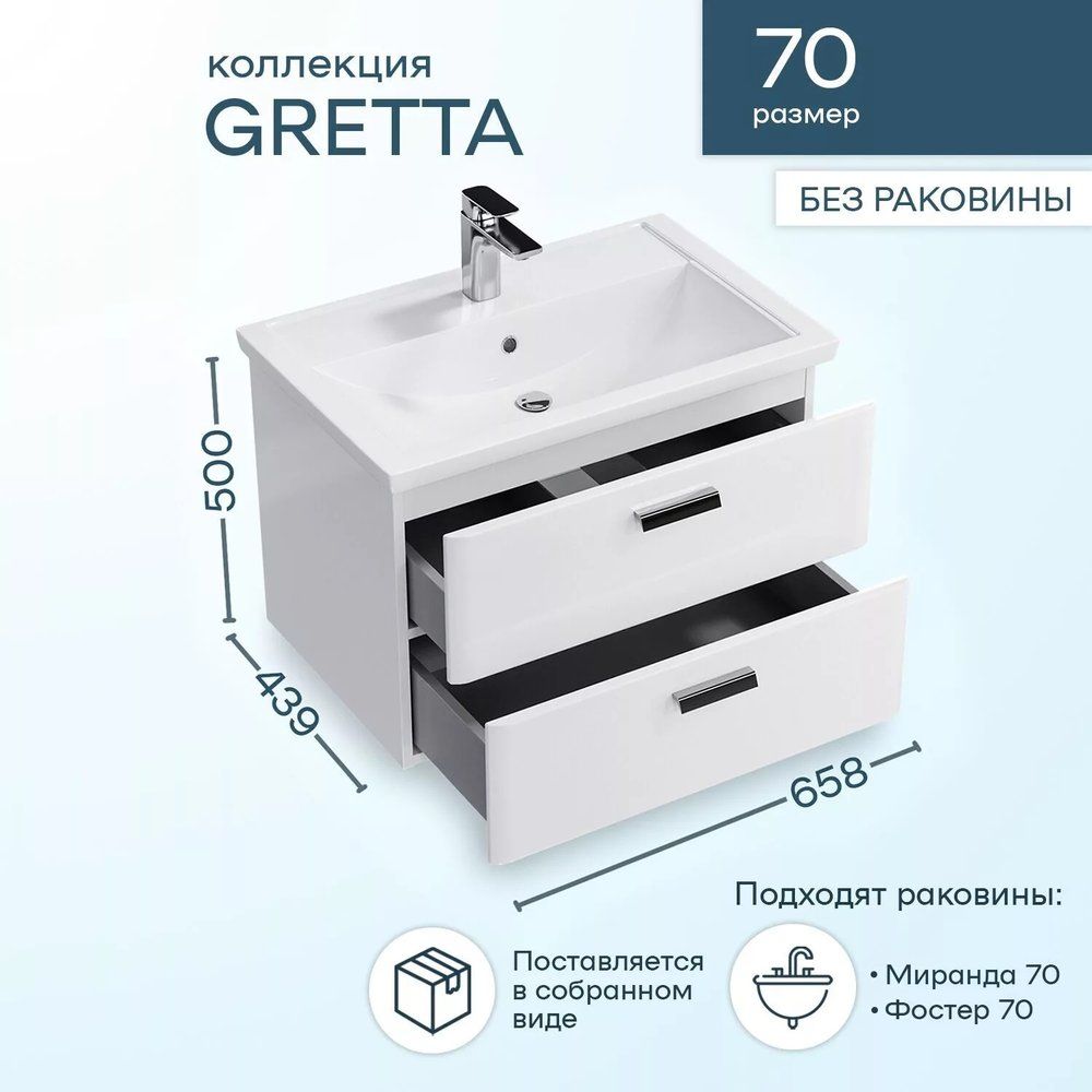 Комплект мебели для ванной SanStar Gretta состоит из трех основных элементов. Тумба подвесная с размерами 65,8x43,9x50 см изготовлена из ЛДСП и фасада из МДФ с эмалевым покрытием. Она оснащена доводчиками для плавного закрывания.