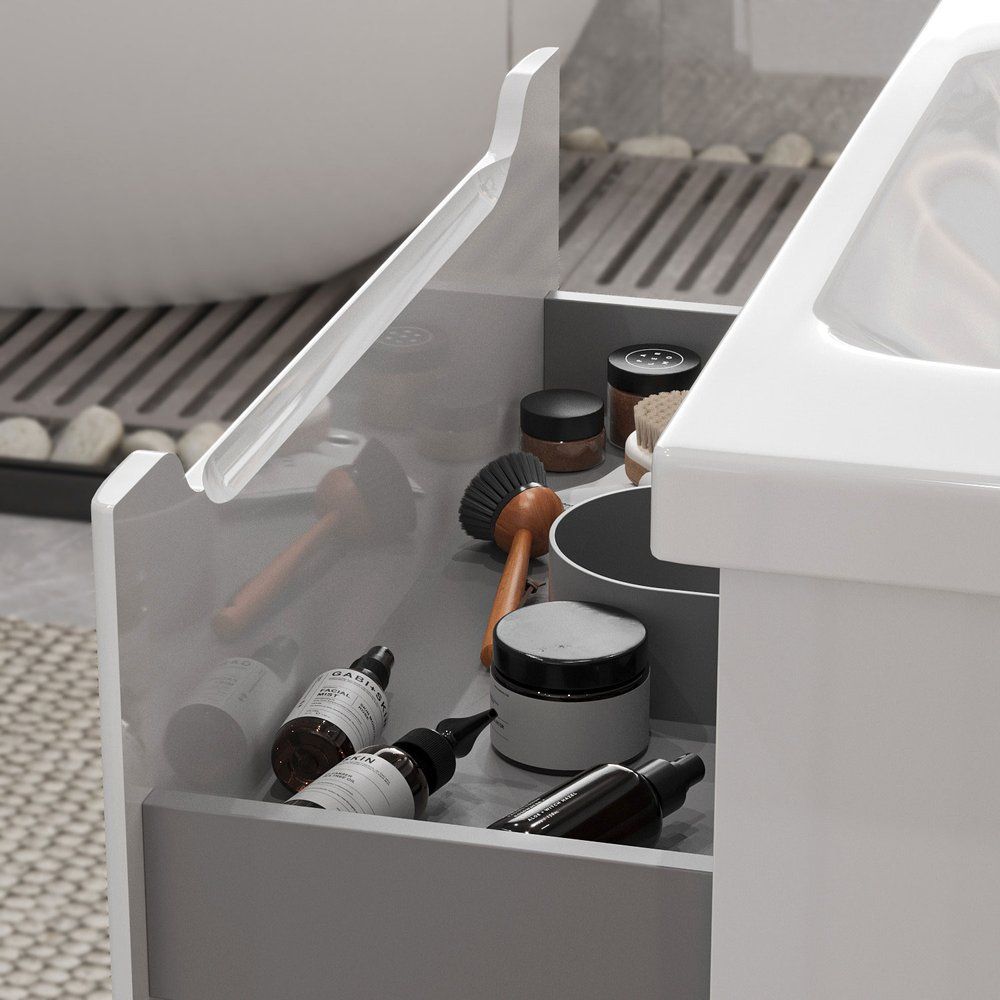 - Современные технологии — механизм доводчика для плавного закрытия и сенсорное управление подсветкой у зеркала.