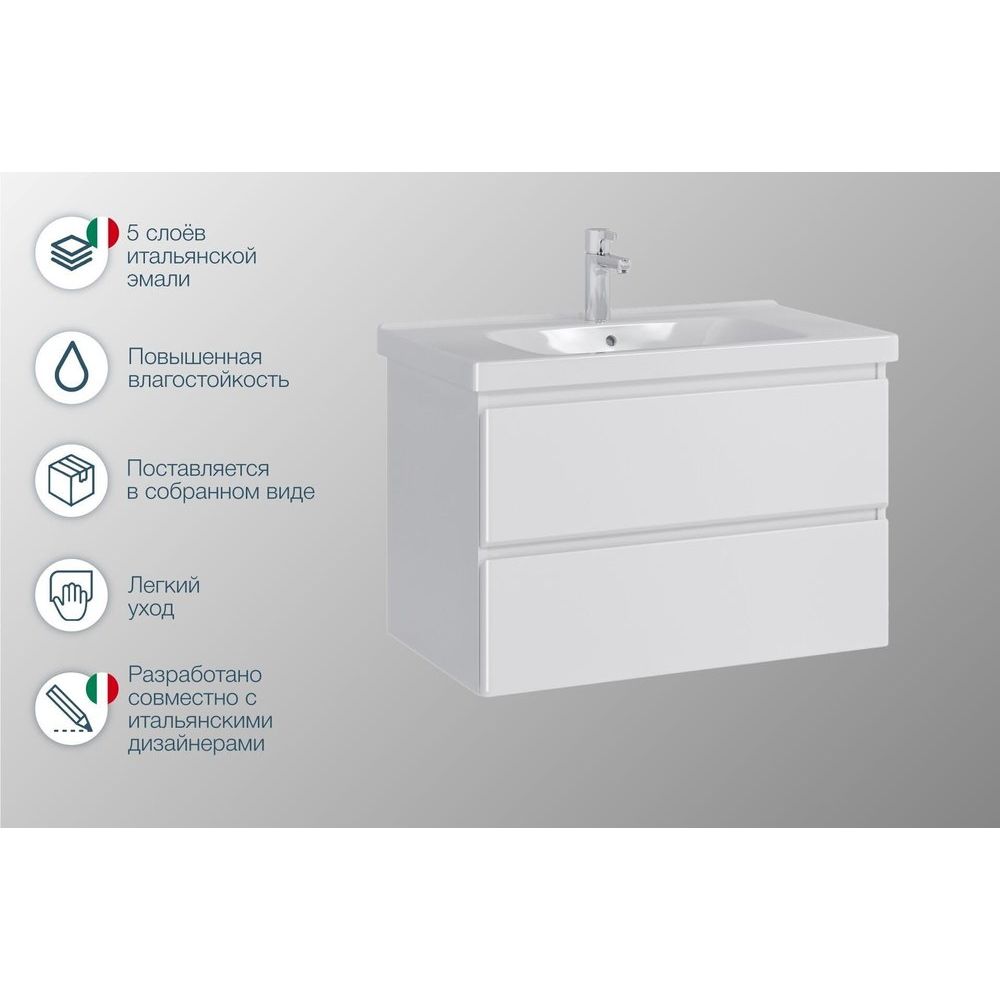 Тумба SanStar Migliore 80 подвесная выполнена в белоснежном оттенке с габаритами 75,4x45,6x50 см. Она оснащена продуманными ящиками с механизмом доводчика, что обеспечивает плавное закрывание. Корпус сделан из ЛДСП, покрытие — эмаль, а фасад из МДФ, защищённый ламинированной поверхностью. Гарантия составляет 3 года, производство - Россия.