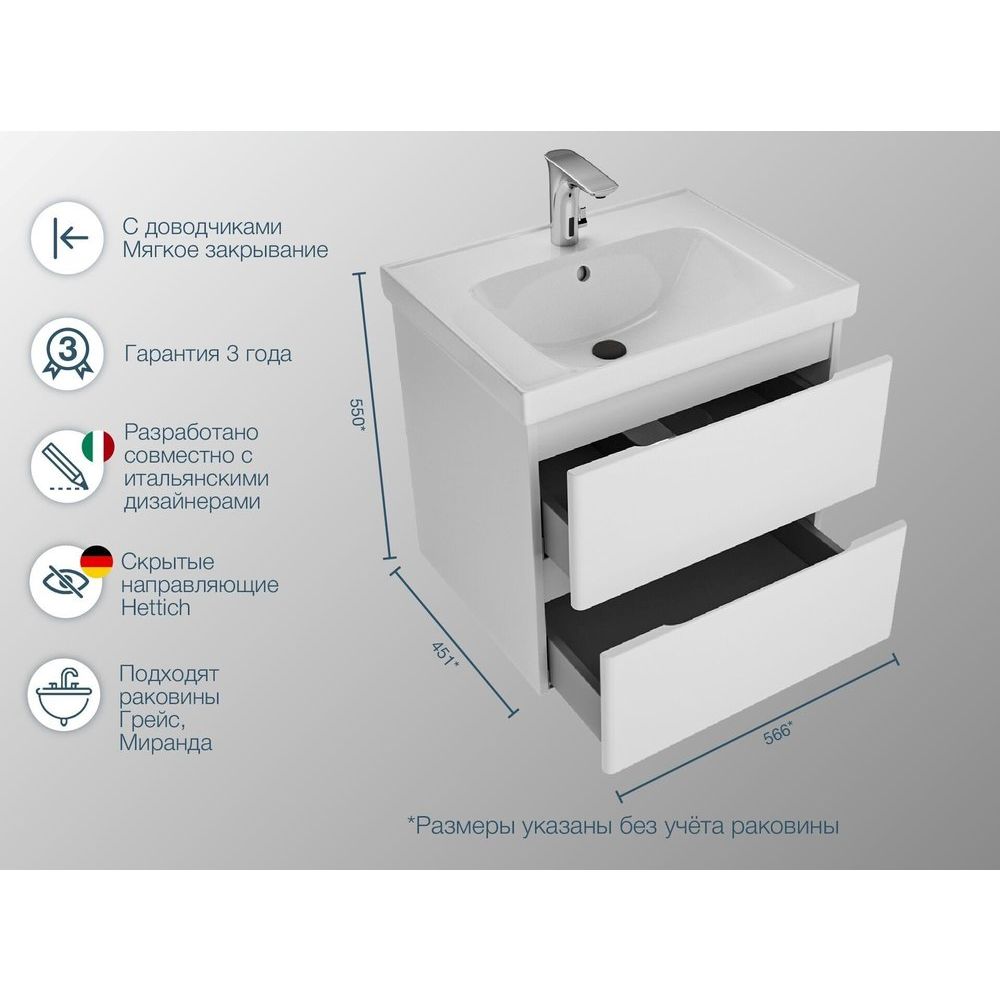 - Тумба SanStar Riana: размеры 56,6x45,1x50 см, подвесная, с механизмом доводчика, из ЛДСП с эмалью на корпусе и МДФ с пленкой на фасаде, с хромированной фурнитурой. Гарантия 3 года.