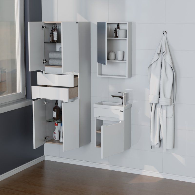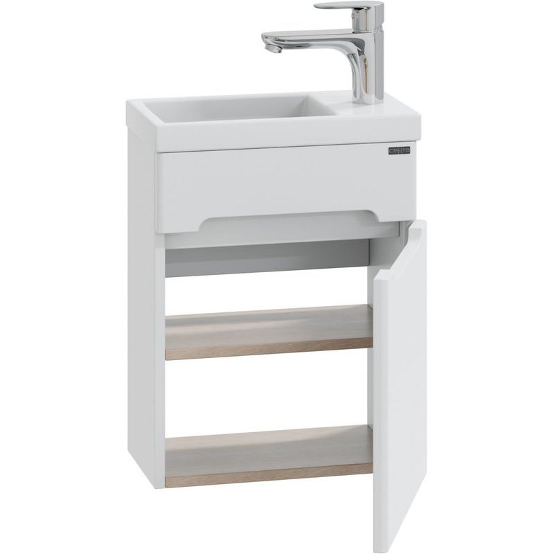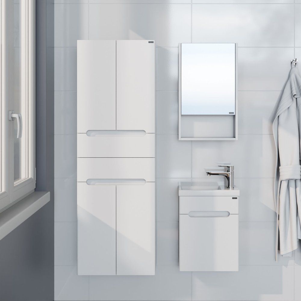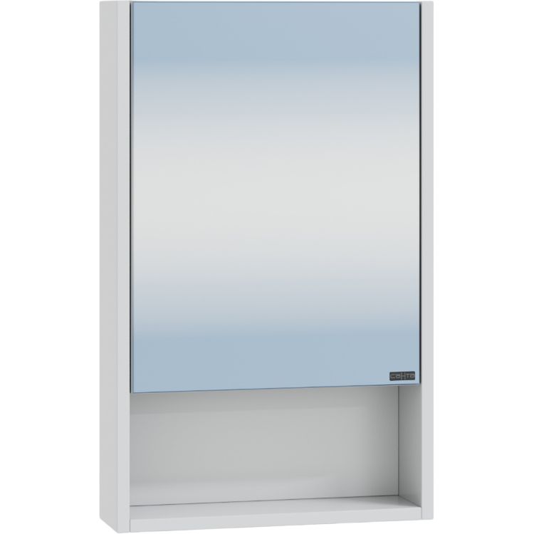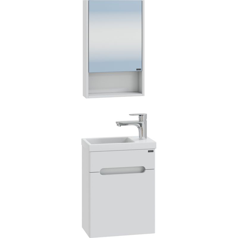 Тумба для ванной комнаты СаНта Лондон 40, подвесная, обладает компактными размерами 40x22x52 см и изготовлена из ЛДСП с ламинированным покрытием. Фасады выполнены из МДФ и покрыты пленкой. Механизм доводчика обеспечивает плавное закрытие дверок, за которыми скрываются несъемные полки. Рукомойник Cersanit Como 40, выполненный из фарфора, имеет встроенный слив-перелив и одно отверстие под смеситель. Зеркало-шкаф СаНта Сити, размером 40x12x65 см, также имеет корпус из ЛДСП без подсветки.