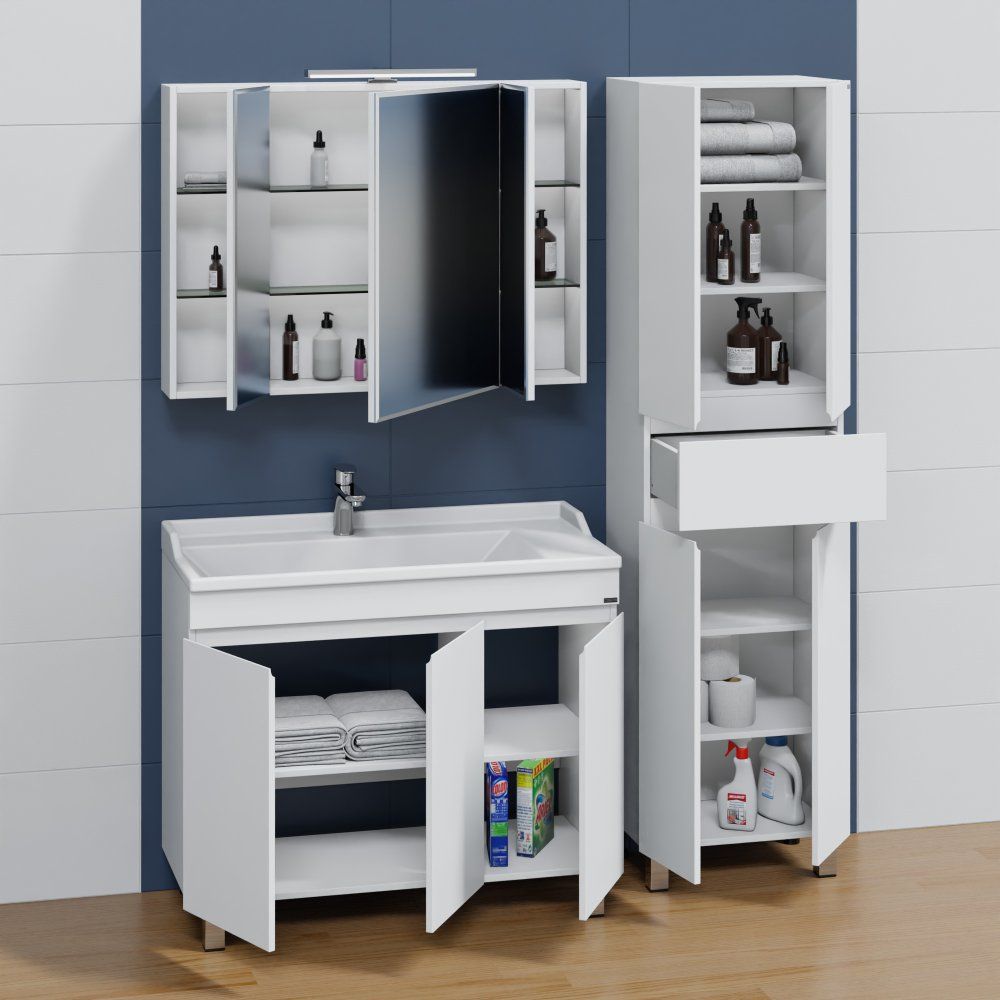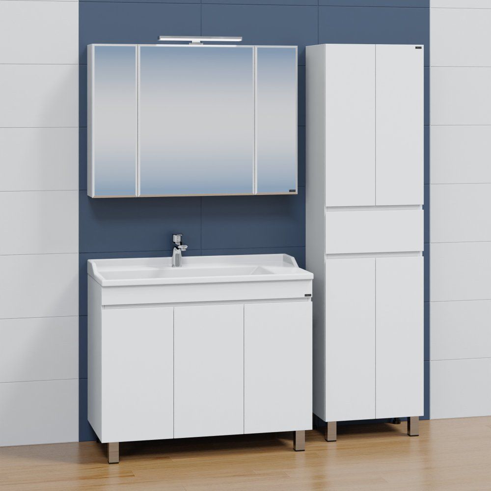 Обновите вашу ванную комнату с изысканным набором мебели СаНта Марс 100, который сочетает в себе элегантность и функциональность. Этот гарнитур станет настоящей находкой для тех, кто ценит стиль и желает наделить интерьер современным звучанием. Мебель для ванной комнаты, включающая напольную тумбу, зеркальный шкаф и раковину из искусственного камня, позволяет создать гармоничный и завершенный образ вашего пространства.