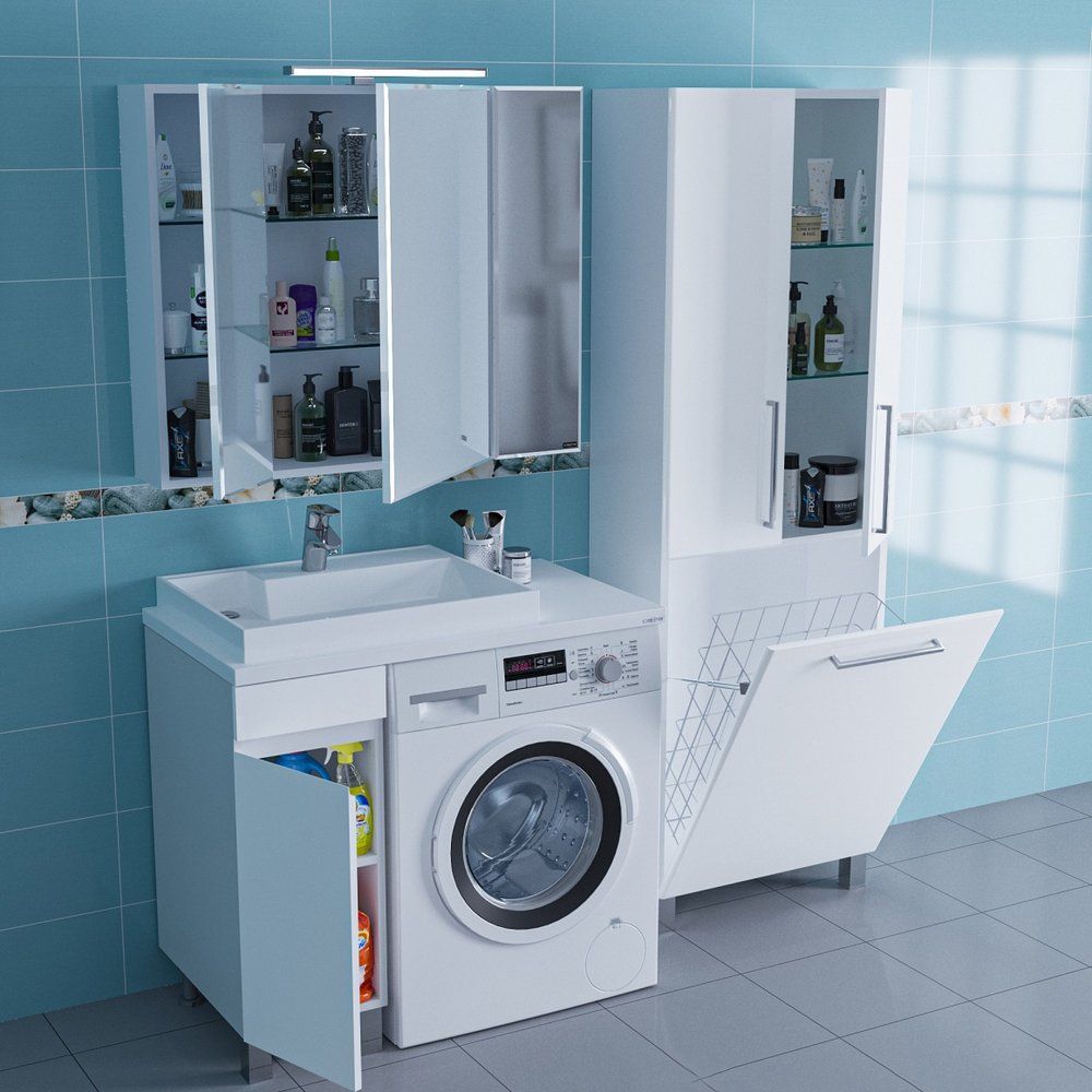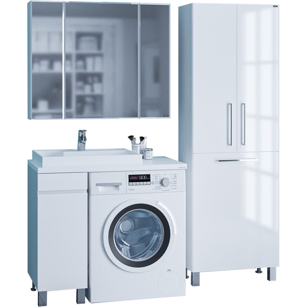 Мебель для ванной комнаты СаНта Марс 29 L — это удачное сочетание стиля и практичности в одном комплекте. Гарнитур с белой матовой эмалью идеально впишется в любой интерьер, добавляя в него современную нотку. Этот набор мебели, состоящий из напольной тумбы, раковины и зеркала-шкафа, предназначен для установки над стиральной машиной, что делает его практичным решением для оптимизации пространства.