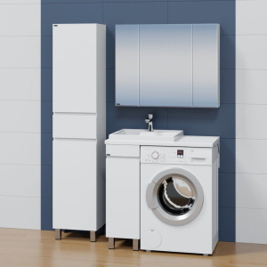 В комплект мебели для ванной СаНта Марс 29 L входит напольная тумба с одной дверцей из эмалированного ДСП, габариты которой составляют 29x49x87 см. Она рассчитана для размещения над стиральной машиной и комплектуется декоративными опорными ножками для устойчивости.
