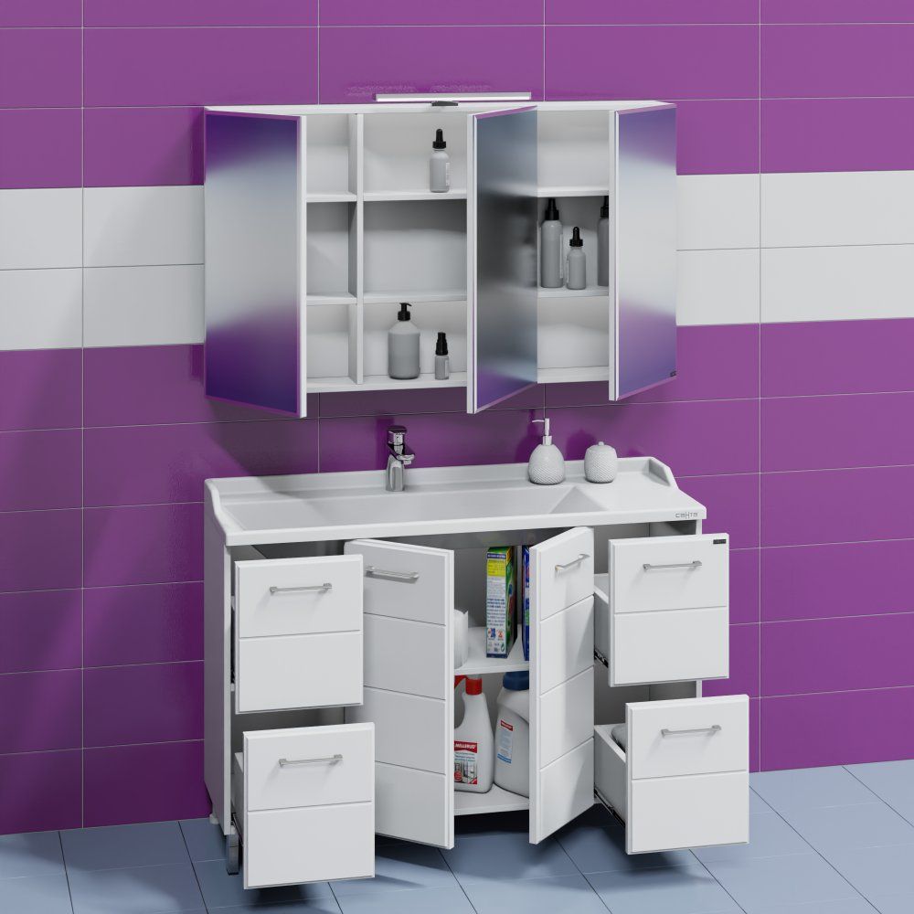 Впечатляющий гарнитур для ванной комнаты из коллекции Омега Люкс от бренда СаНта подарит вашей ванной изысканность и современность. Этот напольный комплект мебели включает в себя белоснежную тумбу с глянцевыми фасадами, зеркало-шкаф и элегантную раковину из искусственного мрамора, создавая гармоничный и стильный образ. Идеален для просторных ванных комнат, предоставляя достаточно места для хранения всех необходимых предметов, от косметики до полотенец. Плавное закрывание ящиков и дверок, снабженных доводчиками, делает использование мебели приятным и удобным, а её хромированные ручки подчёркивают блеск сантехники.