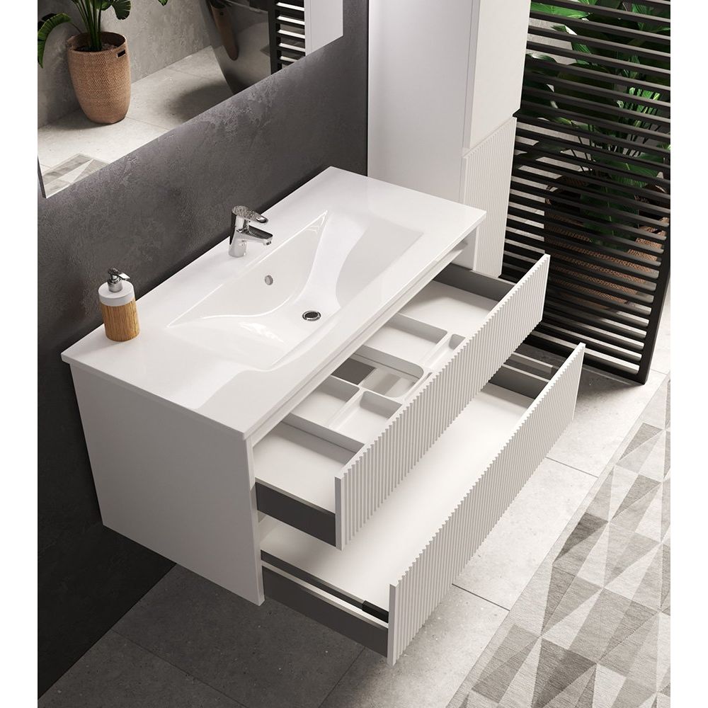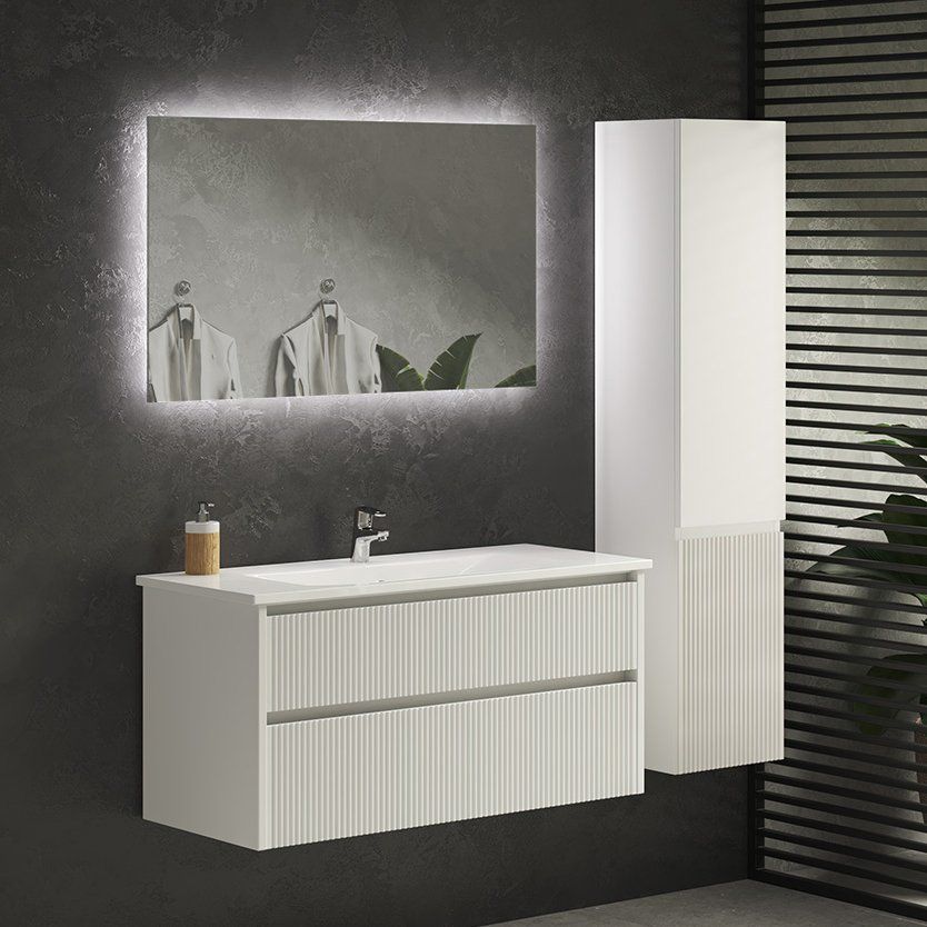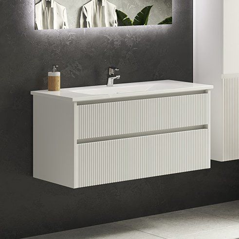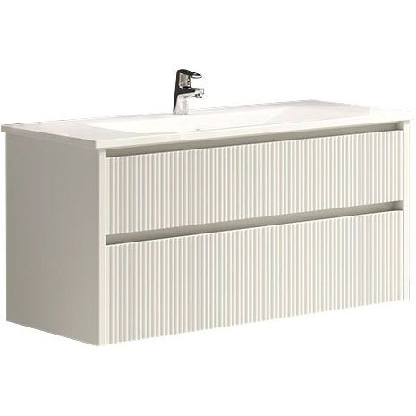 - Подвесная тумба Sanvit 100 белая с габаритами 99x46x50 см. Она выполняет не только практическую функцию хранения, но и стильный акцент в интерьере благодаря объемной фрезеровке фронтальной части.