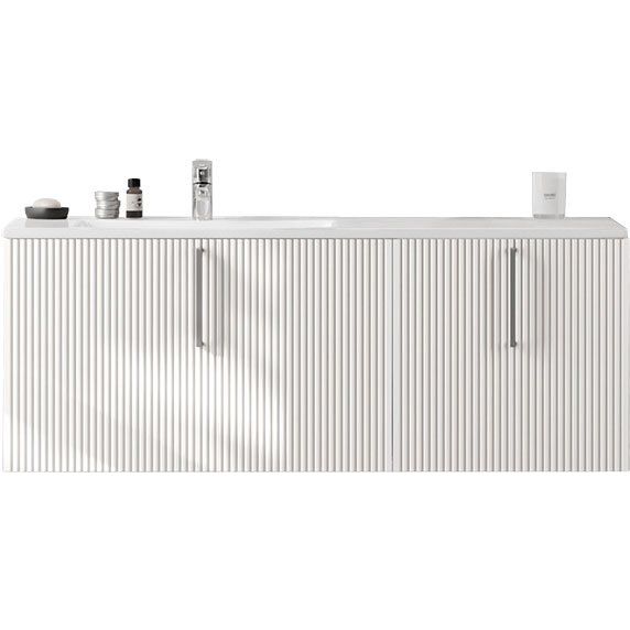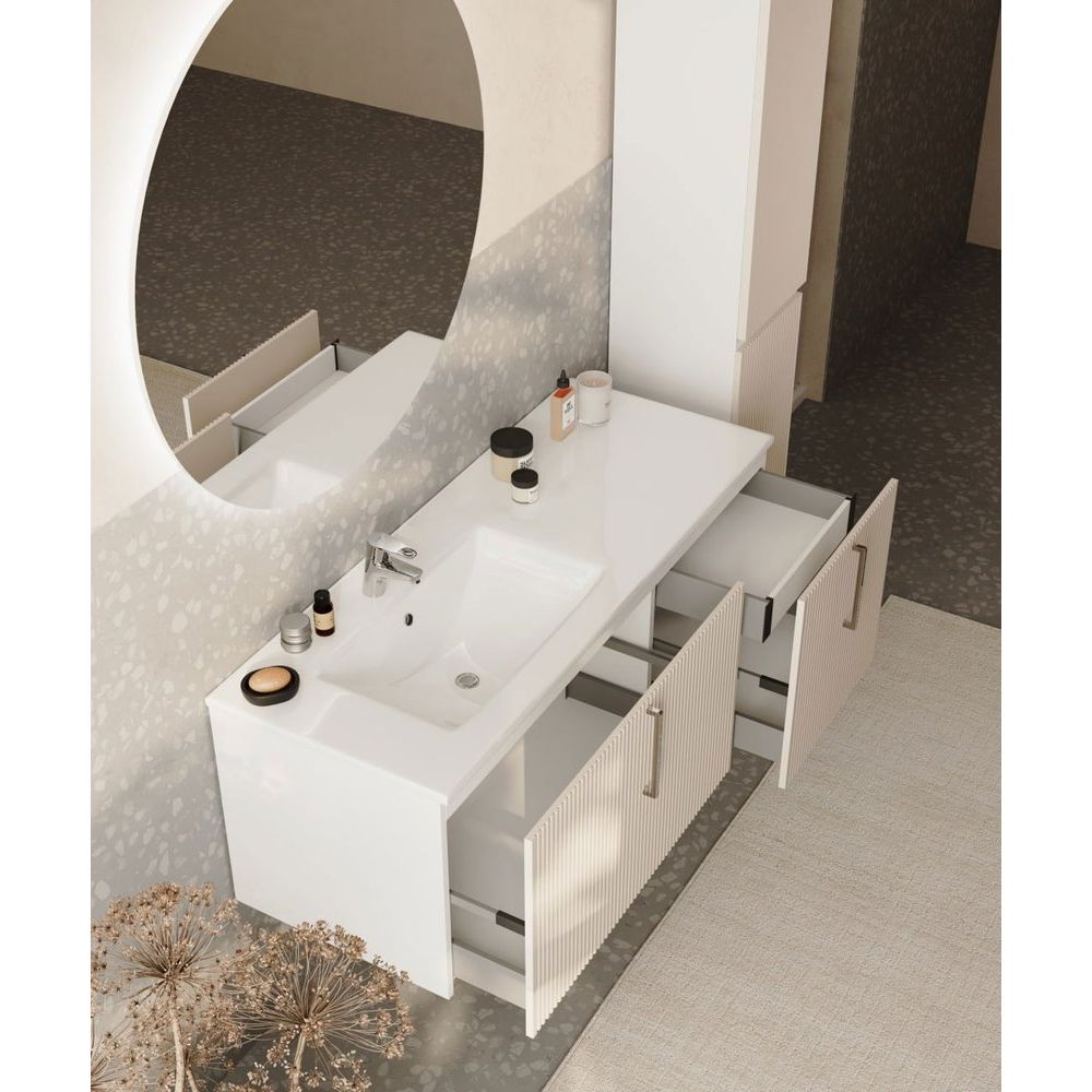 Комплект мебели включает тумбу, раковину и зеркало. Тумба Sanvit 120 с габаритами 120x44,8x45 см является подвесной конструкцией с механизмом доводчика для плавного закрывания ящиков. Корпус и фасад из МДФ в пленочном покрытии белого цвета дополняются хромированной фурнитурой, а объемная фрезеровка фасада добавляет изысканности.
