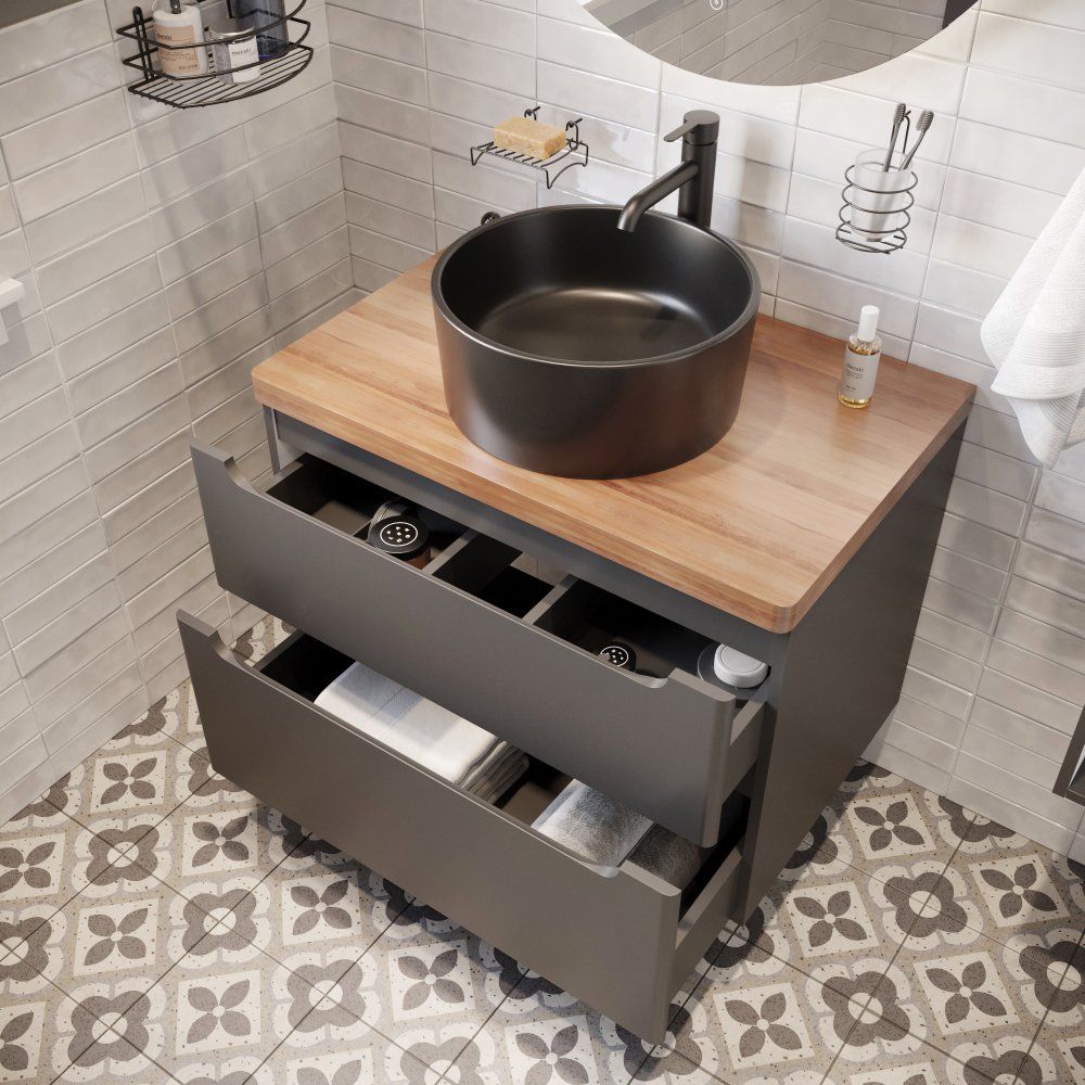Представляем вашему вниманию мебель для ванной комнаты STWORKI Берген 80 — идеальное сочетание стиля и функциональности. Этот набор включает все необходимое для создания современного и удобного пространства вашей ванной. Изящный гарнитур выделяется великолепным сочетанием серого корпуса с темной столешницей и возможностью выбора раковины, что позволяет вам создать интерьер, отвечающий вашим индивидуальным предпочтениям.