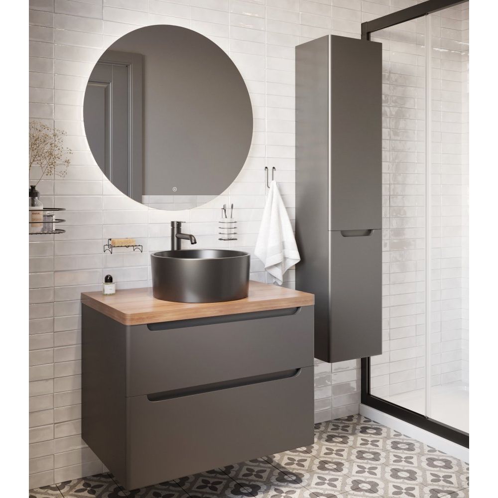 Тумба в комплекте STWORKI Берген 80 — это подвесная конструкция с размерами 79,5x51,5x56 см, выполненная из МДФ с пленочным покрытием, предлагается с плавными механиками для закрывания ящиков. Темная столешница из массива бука размером 80x52x4 см имеет готовое отверстие для смесителя. Черная матовая раковина BOCCHI Vessel из фарфора (38x38 см) дополняет комплект, предлагая высокую износостойкость и декоративную накладку на слив. Большое круглое зеркало STWORKI Ноттвиль диаметром 80 см с регулировкой яркости подсветки и сенсорным управлением добавит изысканности в ванную, а также оборудовано по краям евро-кромкой от AGC для безопасности и элегантного вида. Гарантия на данные элементы варьируется от 2 до 10 лет.