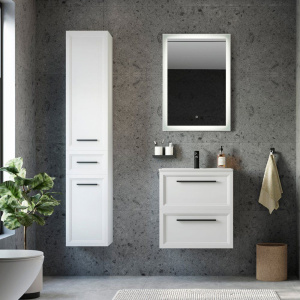 Зеркало с подсветкой и сенсорным переключателем размера 59,6x2,2x85 см изготовлено с использованием ламината и эмали. Встроенная подсветка активируется легким касанием.