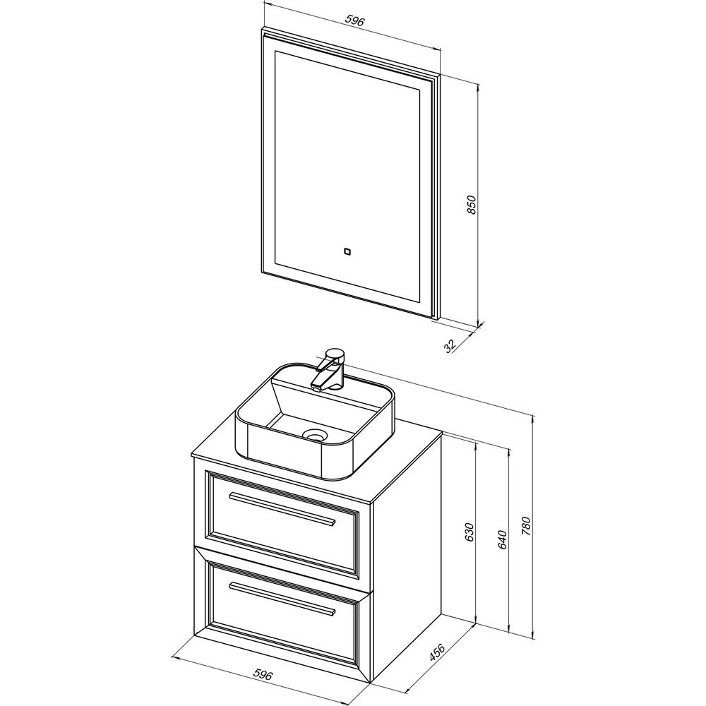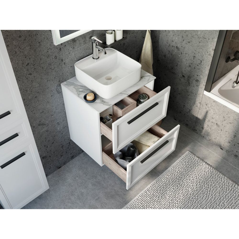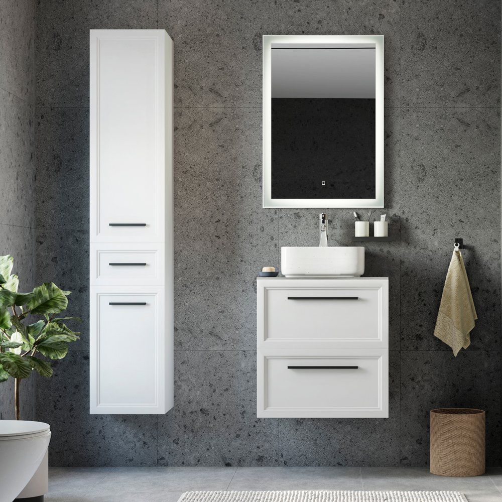 Тумба для комплекта STWORKI Эстерсунд 60 белая матовая имеет размеры 59,6x46,3x63 см. Это подвесная модель с механизмом доводчика и черной фурнитурой, выполненная из ДСП с эмалевым и ламинированным покрытием. Столешница STWORKI 60 выполнена из белого керамогранита и имеет размеры 60,6x46,5x1,1 см. Она поставляется без отверстий под смеситель и готова к индивидуальному обустройству. Раковина STWORKI City 2 из фарфора, размером 39x39 см, оснащена готовым отверстием под смеситель и подходит для сифона диаметром 3,2 см. Зеркало коллекции с габаритами 59,6x2,2x85 см украшено подсветкой, управление которой осуществляется с помощью сенсорного выключателя.
