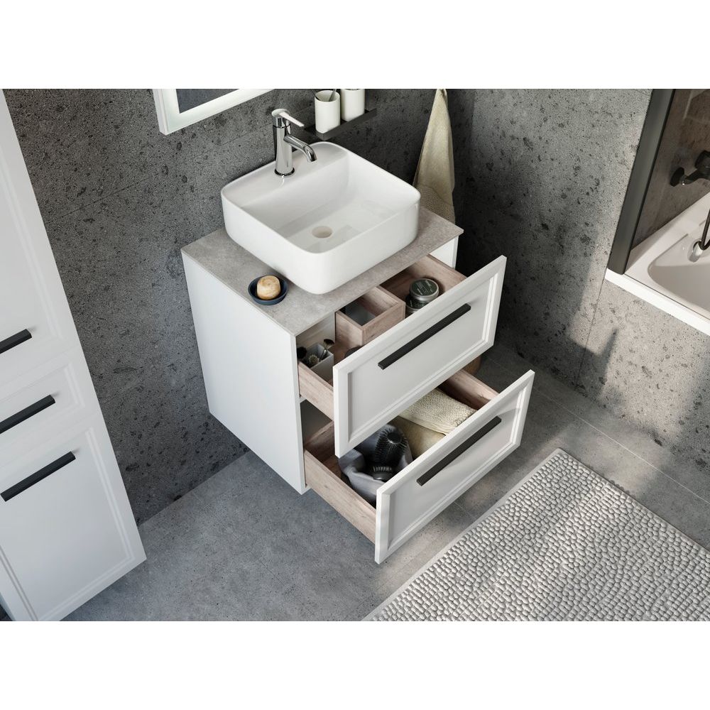 Гарнитур включает тумбу из ДСП с эмалью и ламинатом, размером 59,6х46,3х63 см, нейтральные черные акценты в деталях фурнитуры и встроенные ящики для хранения. Столешница из бежевого керамогранита имеет размер 60,6х46,5х1,1 см и поставляется без отверстий для смесителя, обеспечивая гибкость в установке. Мебельная раковина, выполненная из прочного фарфора, имеет габариты 39х39 см с готовым отверстием под смеситель и рассчитана на использование сифона диаметром 3.2 см. Зеркало размером 59,6х2,2х85 см оборудовано современной сенсорной подсветкой, которая включается легким касанием.