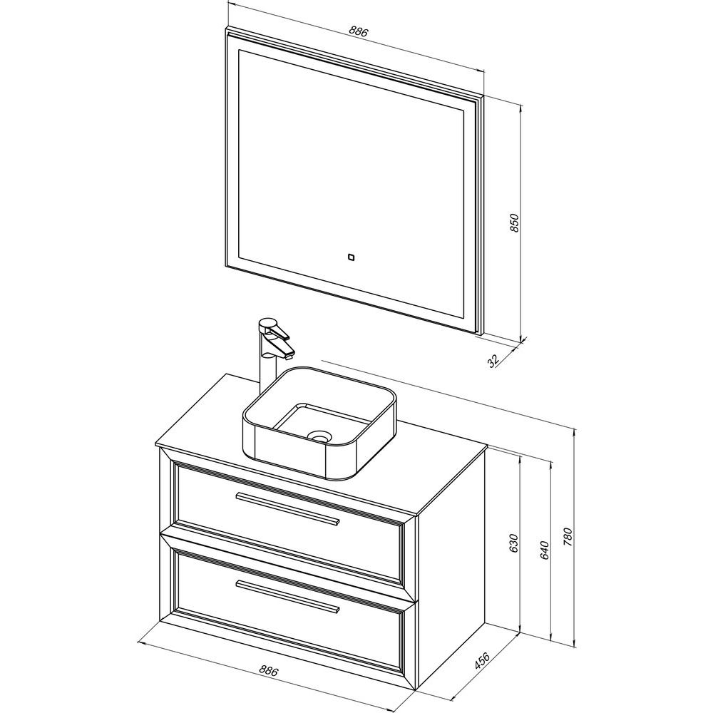 Зеркало с подсветкой и сенсорным выключателем управляется легким касанием и имеет размеры 88,6x2,2x85 см. Оно подвесное, что добавляет интерьеру ванной комнаты лёгкости и модерна.