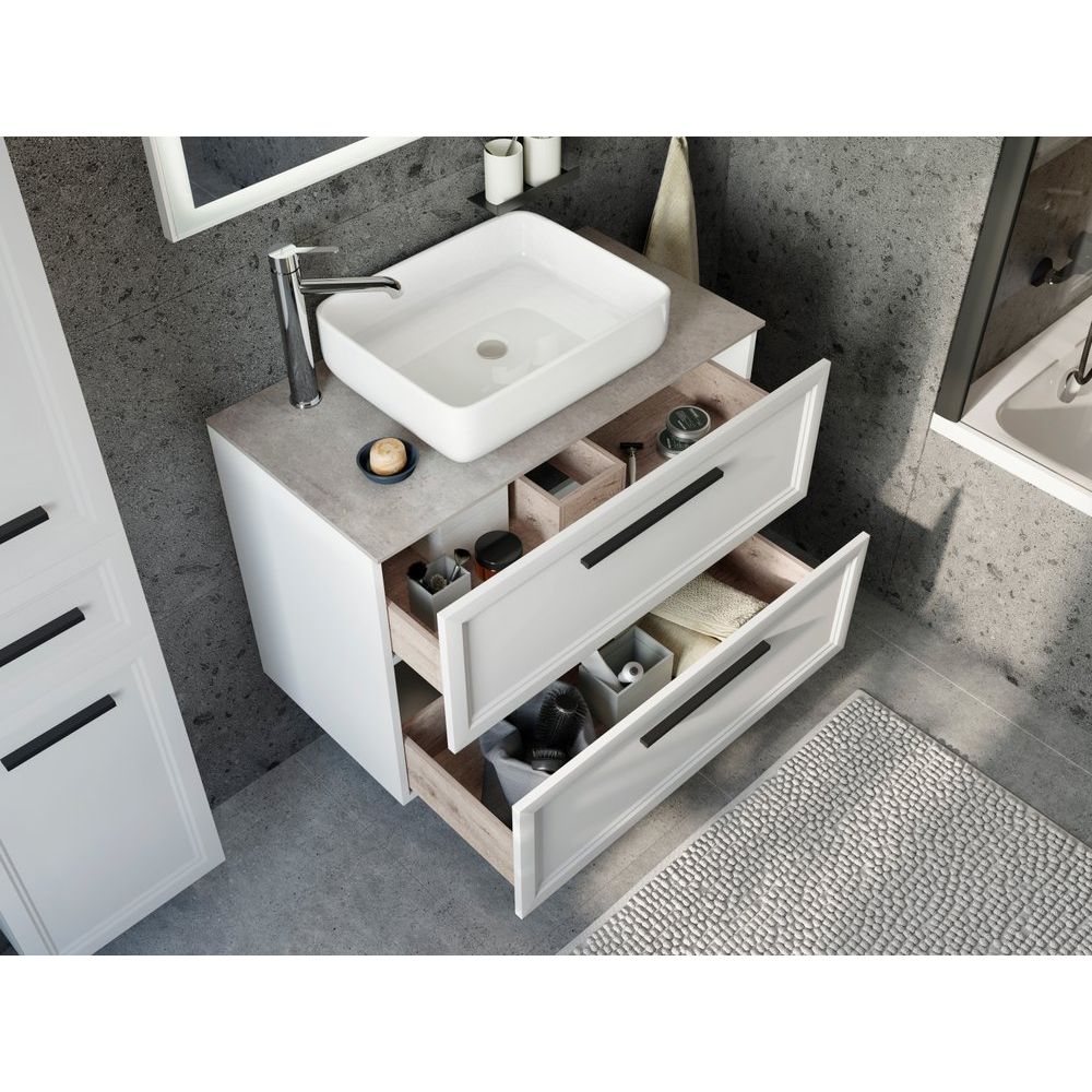 Тумба STWORKI Эстерсунд 90 имеет размеры 88,6x46,3x63 см. Она выполнена из ДСП с эмалевым и ламинатным покрытием, дополнена фасадами из МДФ и черной фурнитурой. Подвесная конструкция с механизмом доводчика обеспечивает плавное закрывание ящиков и подходит для компактного размещения. Столешница из бежевого керамогранита 90,6x46,5x1,1 см оснащена отверстием для смесителя и идеально комплектуется раковиной STWORKI City 1 из фарфора размером 38,5x38,5 см. Раковина специально адаптирована для сифонов диаметром 3,2 см, а изделие требует отдельной покупки донного клапана. Завершает композицию зеркало STWORKI Эстерсунд 90 с ламинированным и эмалевым покрытием и встроенной подсветкой на сенсорном управлении.