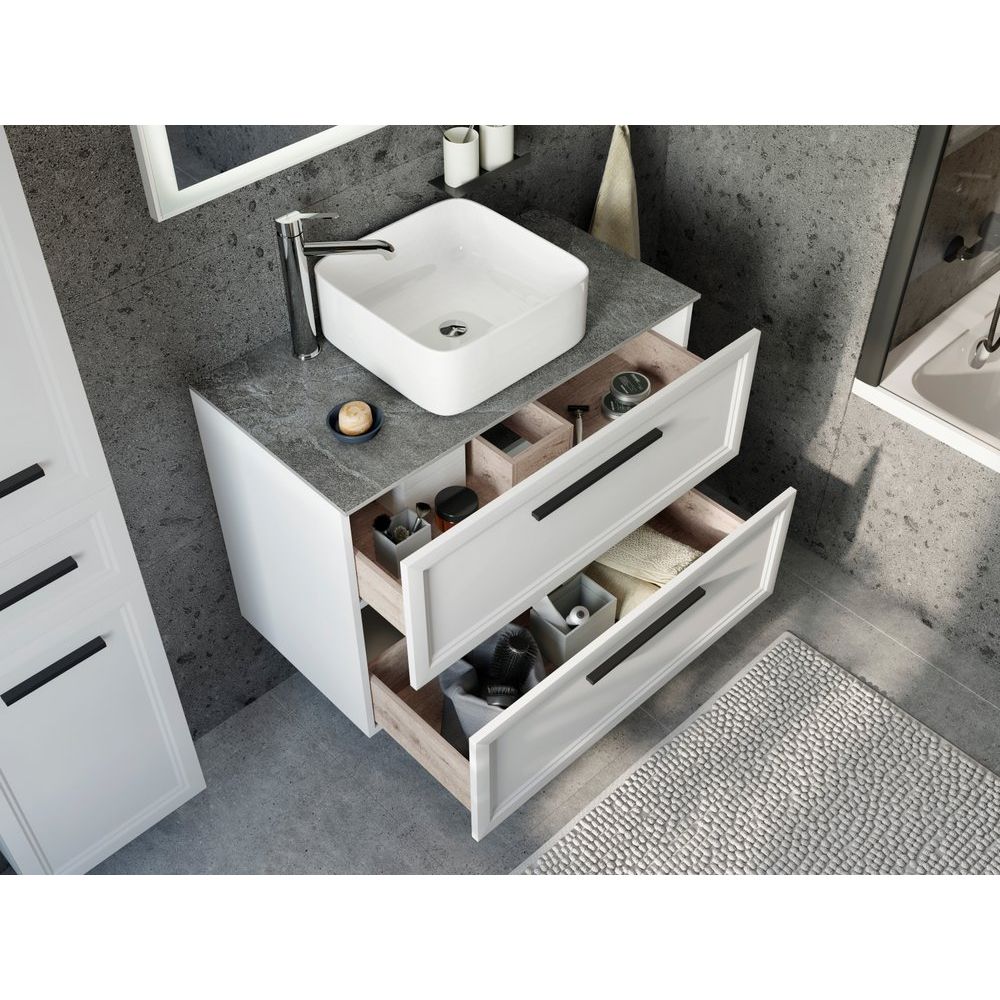 Тумба из ДСП с матовым покрытием размером 88,6x46,3x63 см оснащена черной фурнитурой и механизмом доводчика для плавного закрытия ящиков. Столешница из серого керамогранита размером 90,6x46,5x1,1 см с одним отверстием под смеситель. Мебельная раковина STWORKI City 1 из фарфора имеет размеры 38,5x38,5 см и рассчитана на сифон диаметром 3,2 см (донный клапан приобретается отдельно). Зеркало белого матового цвета с подсветкой и сенсорным выключателем размером 88,6x2,2x85 см дополнено подвесами. Гарантия на мебель составляет 2 года, на раковину — 5 лет. Произведено в России и Китае.