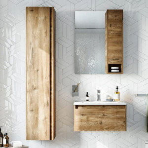 Тумба «Карлстад 60» имеет габариты 59,6x46x32 см и изготовлена из ЛДСП с ламинатным покрытием как корпуса, так и фасада. Включает тихие направляющие с доводчиками. Мебельная раковина из фарфора размера 60,9x47 см подходит для сифона 3.2 см в диаметре и оснащена встроенным сливом-переливом. В комплекте также полка под тумбу размером 59,6x46x16 см. Зеркало «Мальмё 77» дополнено 120 светодиодами на метр для равномерной подсветки и сенсорным выключателем для удобства использования.