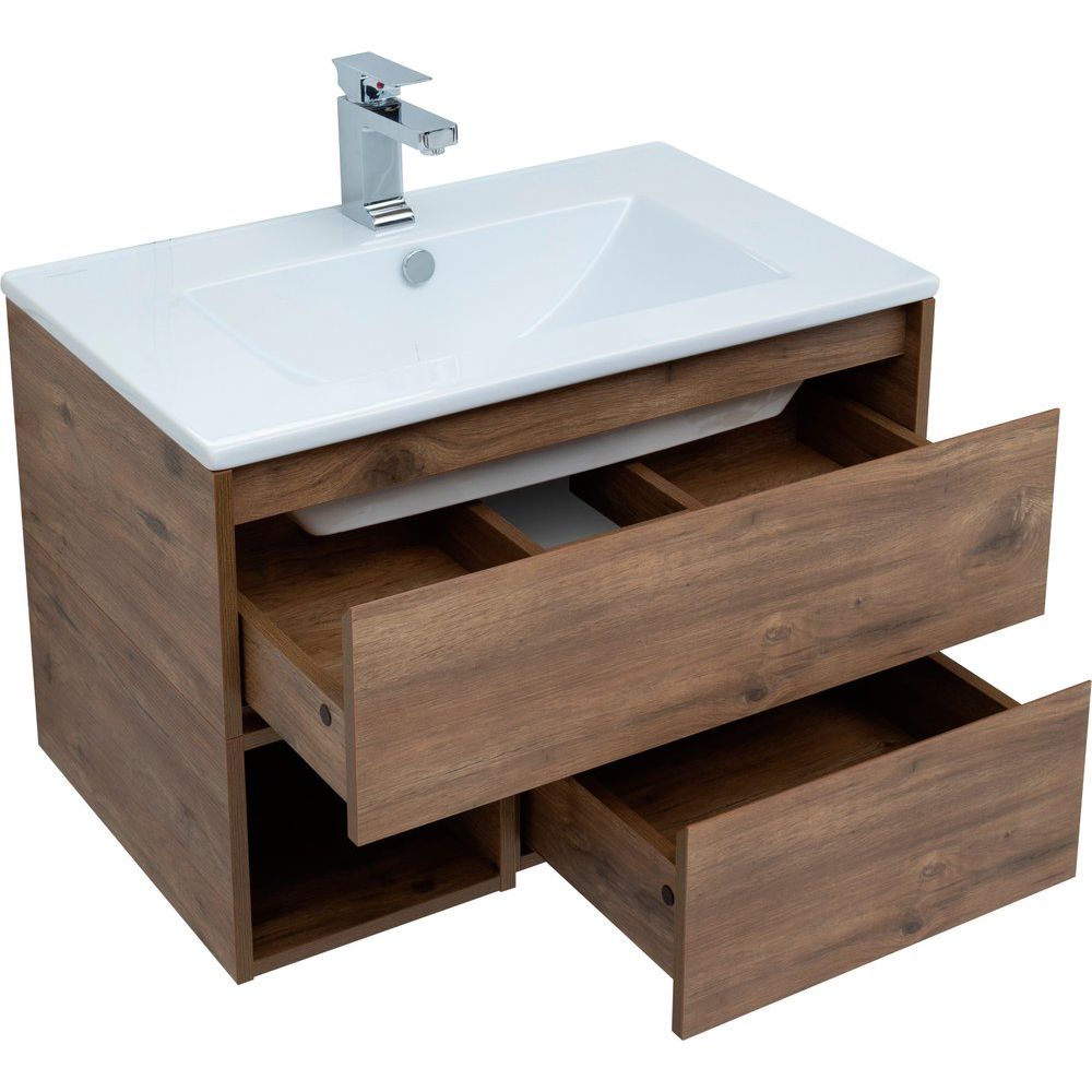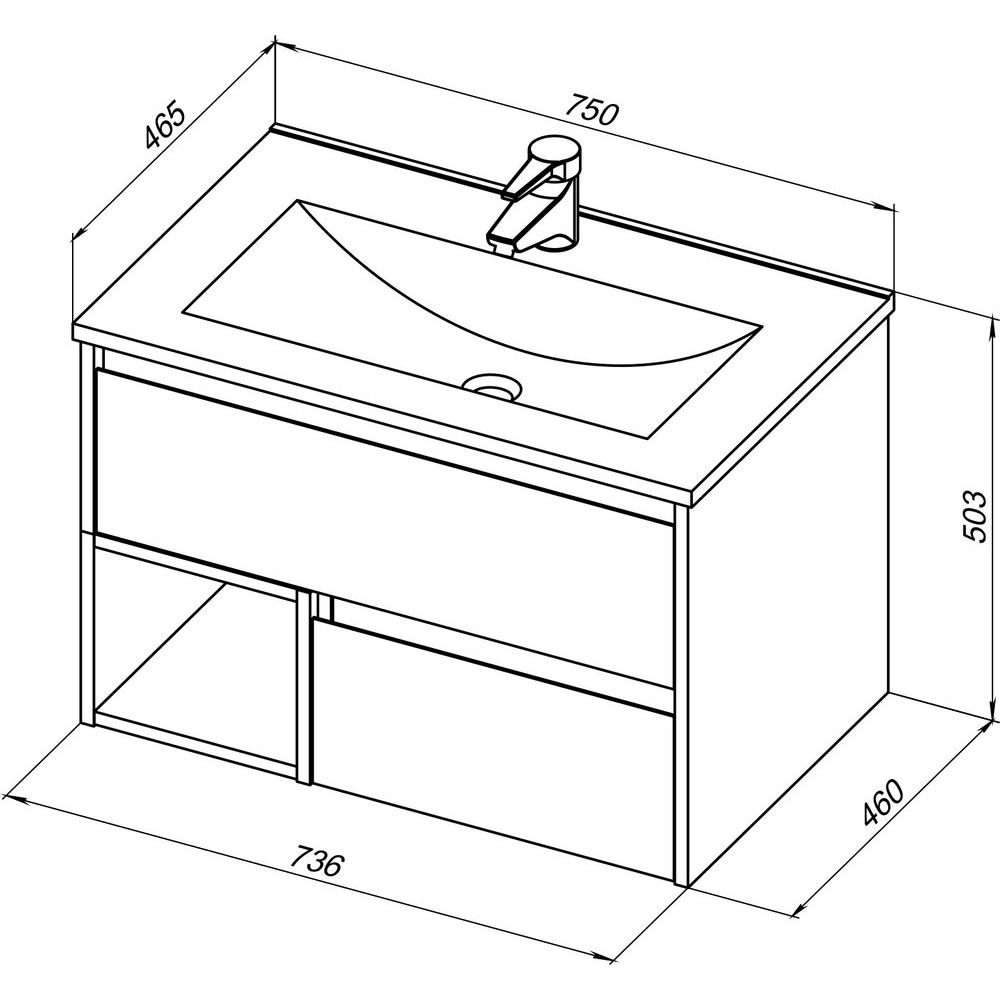 Тумба «STWORKI Карлстад 75» имеет размеры 73,6x46x48 см. Она подвесная, выполнена из ламинированной ЛДСП с примерной толщиной корпуса 17 мм и фасада 20 мм, что обеспечивает долговечность и устойчивость к влаге. В комплекте идут закрытые ящики и открытые полки.