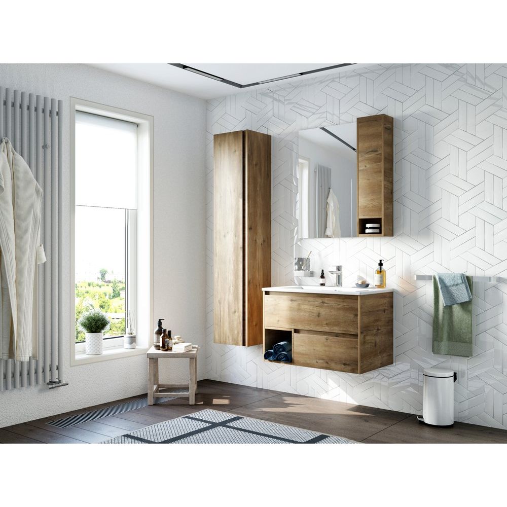 Мебельный гарнитур для ванной комнаты «STWORKI Карлстад 75» в стиле лофт является идеальным решением для тех, кто ценит функциональность и стиль. Этот комплект позволит вам рационально организовать пространство в вашей ванной комнате, предоставляя удобные места для хранения в виде двух ящиков и открытой ниши в тумбе, а также дополнительной полочки в зеркальном шкафу. Благодаря системе Push-to-Open и встроенным ручкам, открытие и закрытие ящиков и дверец происходит без усилий и шума. Фурнитура от Hettich Quadro Silent System обеспечит долголетие службы гарнитура, а дополнительно приобретаемый компактный шкаф-пенал прекрасно дополнит ваш интерьер.