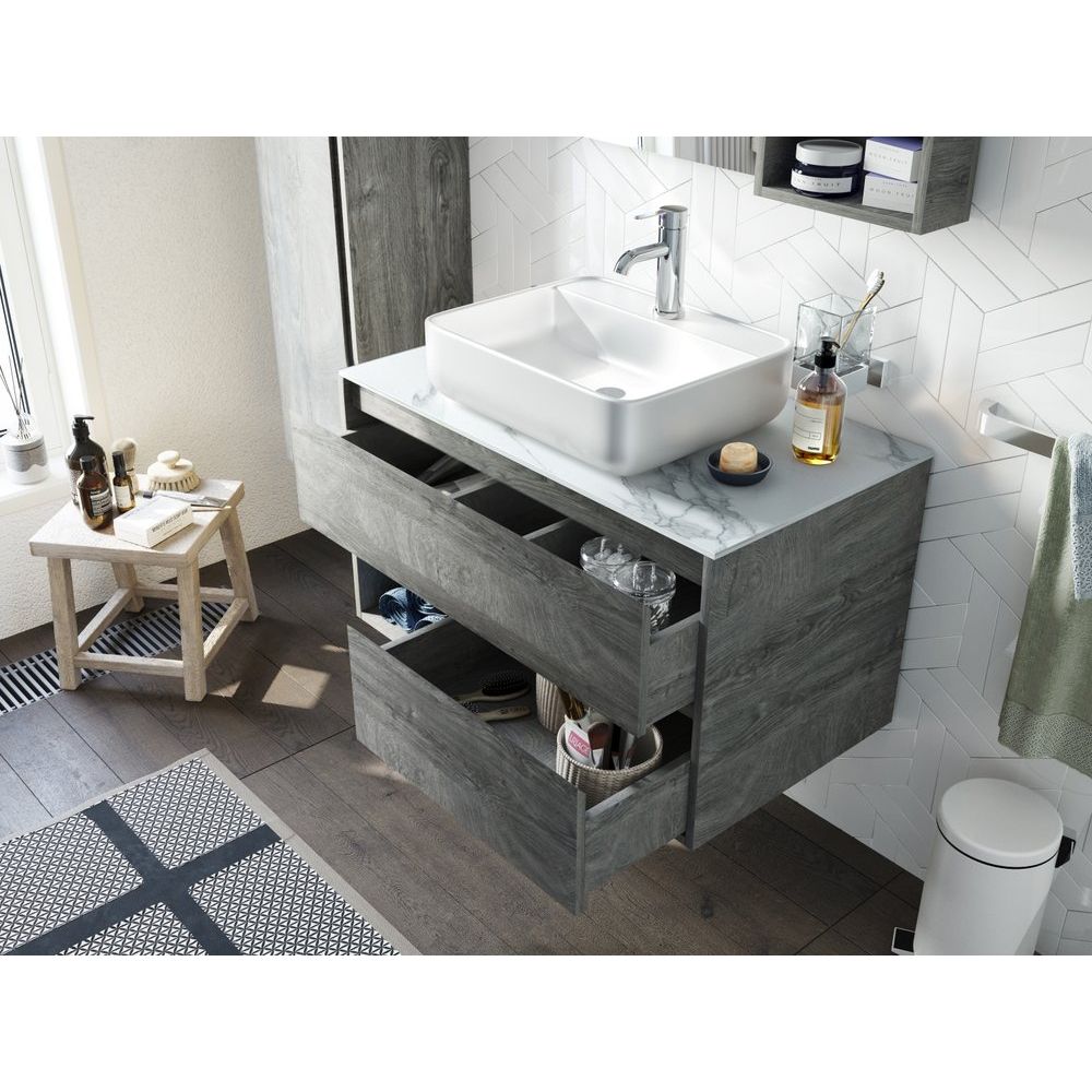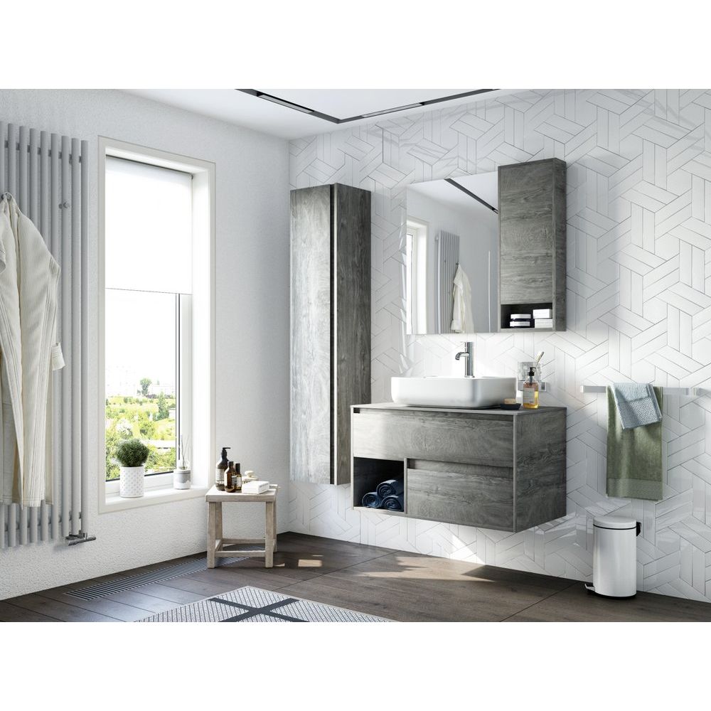 Гарнитур для ванной комнаты Stworki «Карлстад 90» — это идеальное решение для тех, кто ценит современный стиль в интерьере и высокое качество материалов. Подвесная мебель выполнена в элегантной отделке «дуб рошелье» без выступающих деталей, что обеспечивает ее лаконичность и практичность. Особенностью набора является механизм Push-to-Open в зеркале-шкафу, который облегчает открывание дверец простым нажатием. В ящиках использована фирменная система направляющих Hettich Quadro Silent System для плавного и бесшумного выдвижения. Комплект также включает столешницу из керамогранита, защищающую от воздействия влаги, и функциональную тумбу с открытыми нишами для быстрого доступа к предметам. Гарнитур может быть дополнен узким пеналом с вариативной ориентацией для оптимального использования пространства.