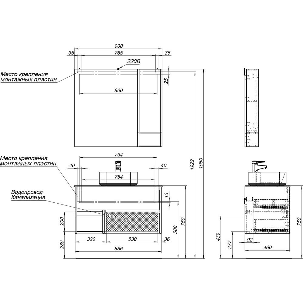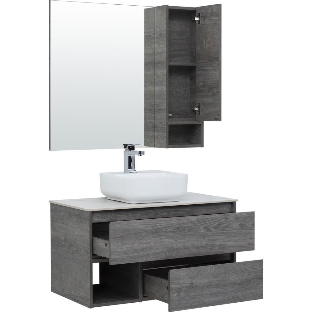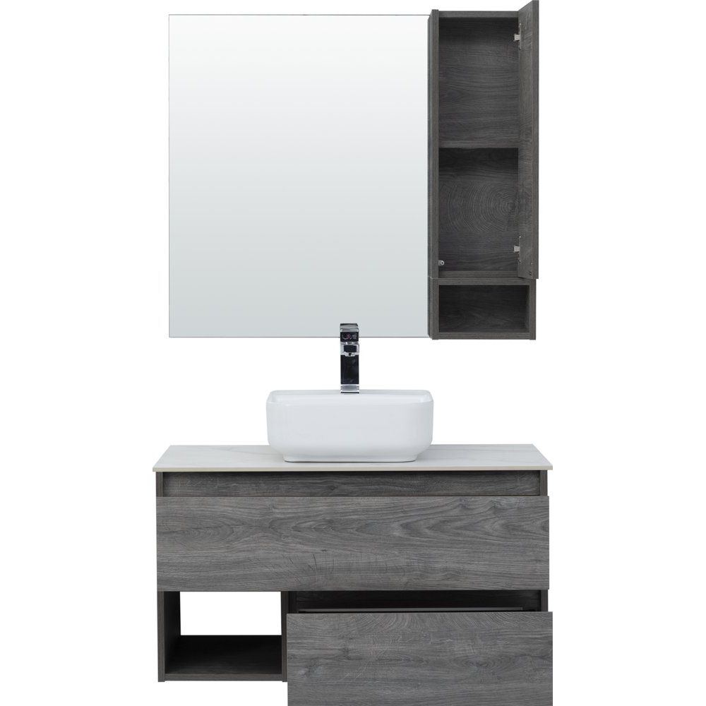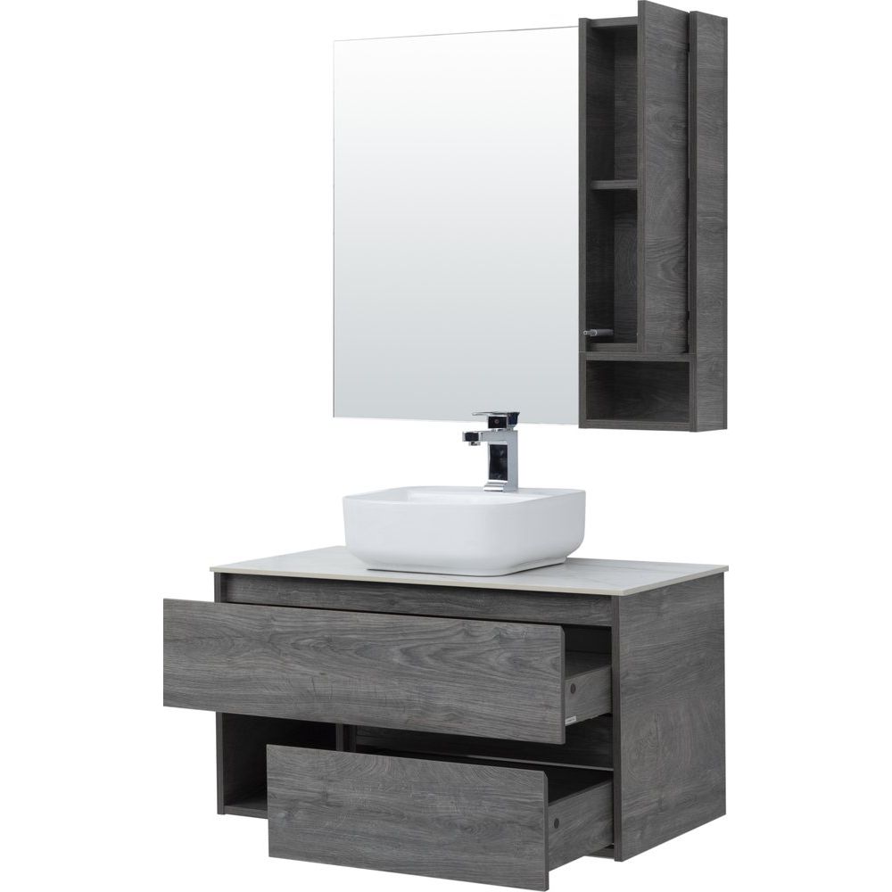 Тумба коллекции «Карлстад 90» в цвете дуб рошелье имеет размеры 88,6х46х48 см и выполнена из ЛДСП с ламинированным покрытием. Она снабжена доводчиками для плавного закрывания ящиков. Столешница из керамогранита, размером 90,6х46,5х1,1 см, без готовых отверстий под смеситель, при этом ее цвет — белый. Раковина STWORKI City 2, изготовленная из фарфора, имеет габариты 39x39 см и одно готовое отверстие под смеситель. Она требует отдельного приобретения донного клапана и сифона диаметром 3,2 см. Зеркало размера 90x14x80 см, выполнено из ДСП и оснащено нажимным механизмом открывания дверцы. Все элементы производятся в России и сопровождаются гарантией от 2 до 5 лет.