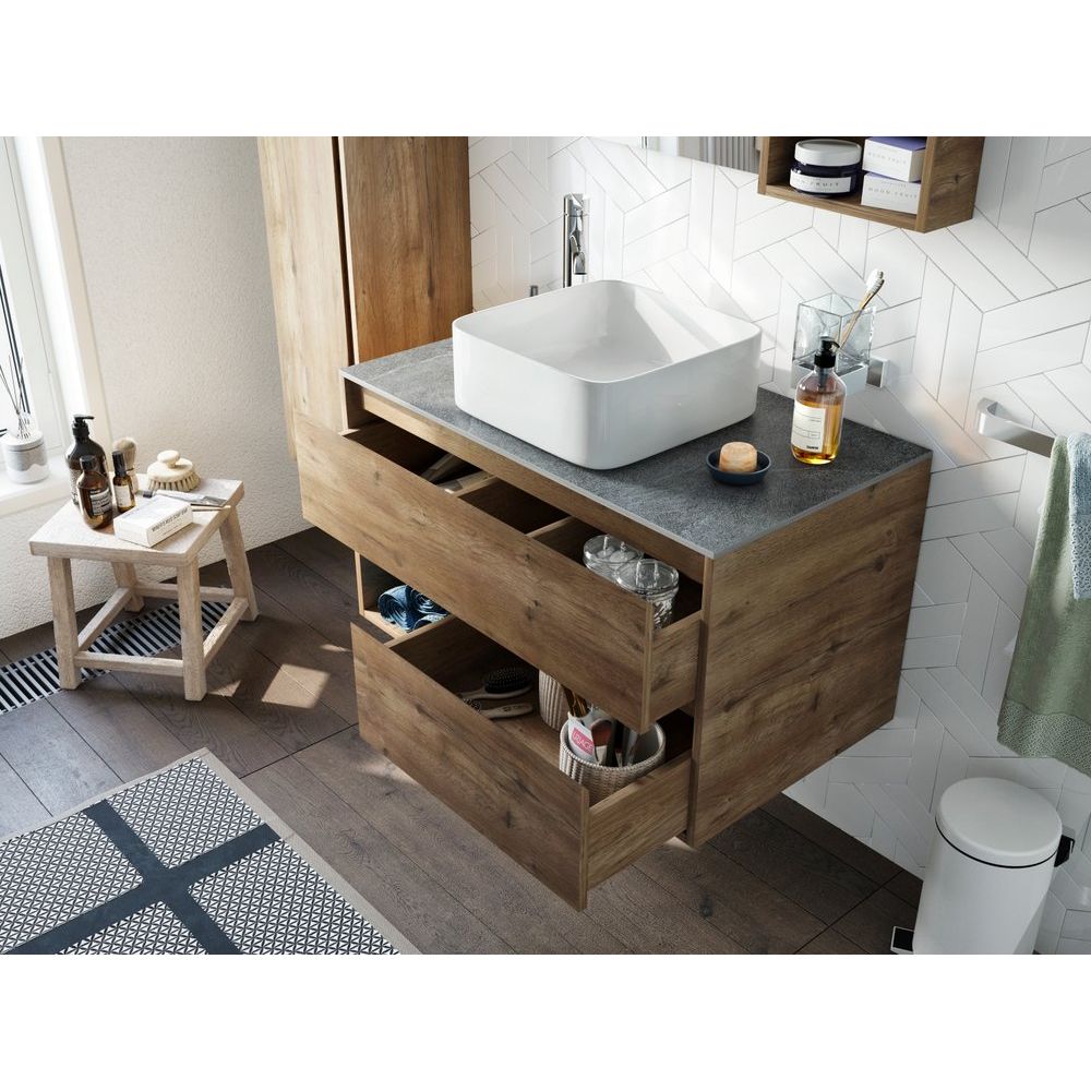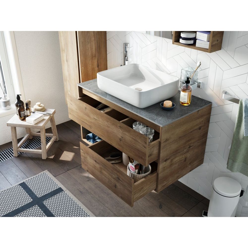 Коллекция мебели для ванной комнаты STWORKI "Карлстад 90" сочетает в себе изысканную древесную текстуру и функциональный минимализм, который гармонично вписывается в современный интерьер. Благодаря теплым натуральным оттенкам дуба рустикального и поверхности роверелла, ваше помещение приобретет неповторимый уют. Гарнитур оснащен функциональной тумбой с двумя ящиками и открытой нишей, дополненной столешницей с отверстием для смесителя, что делает его практичным выбором для вашей ванной комнаты.