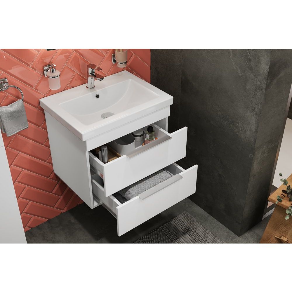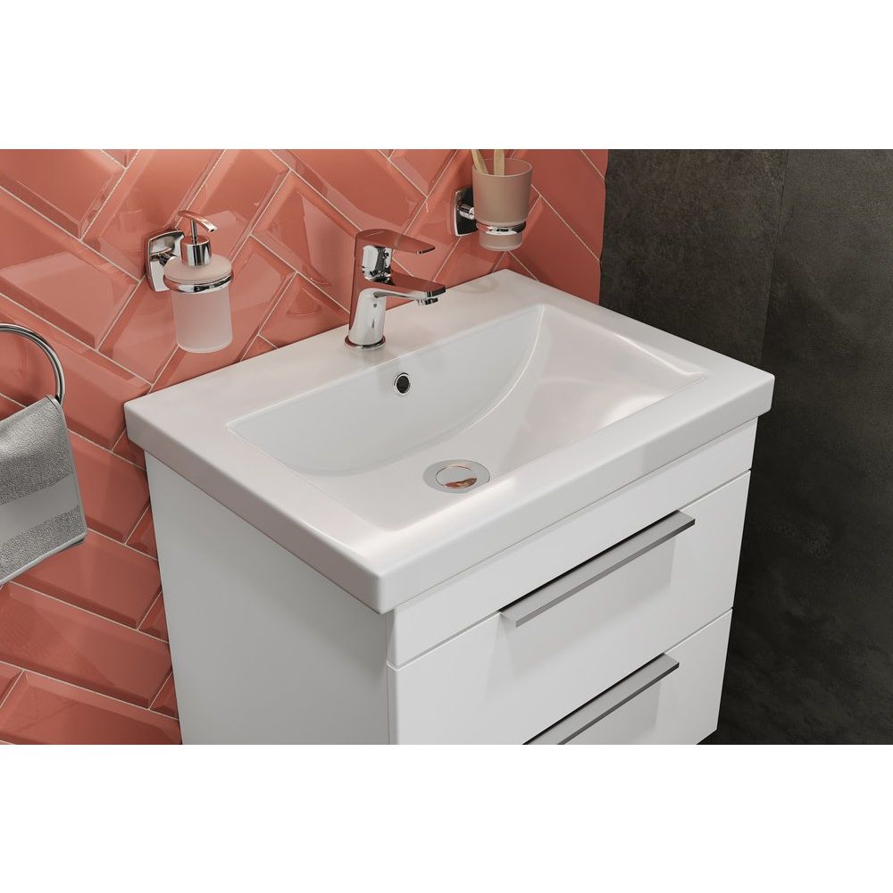 Мебельная раковина Cersanit Como 60, также подвесная, изготовлена из надежного фарфора; её размеры 60x45 см. Раковина оснащена встроенным сливом-переливом и имеет 1 отверстие под смеситель. Обратите внимание, что донный клапан необходимо приобретать отдельно.