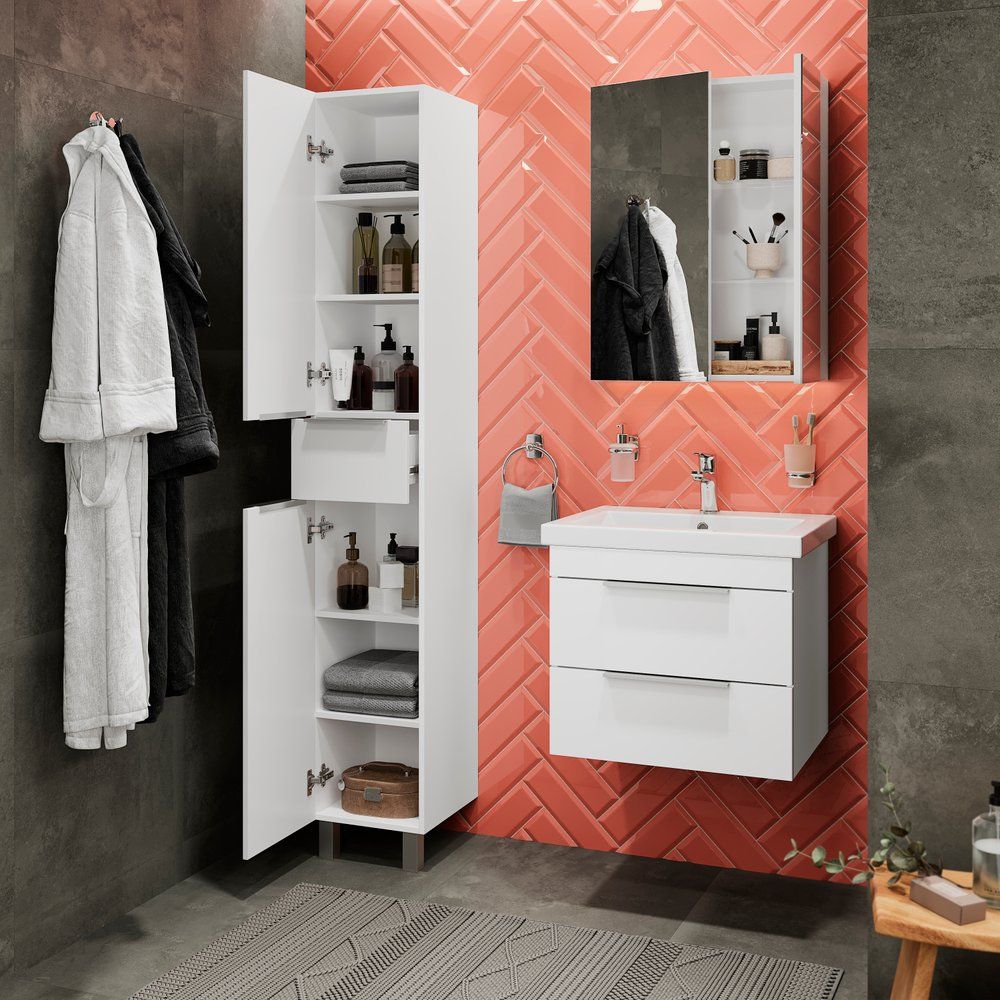 Мебель для ванной комнаты STWORKI "Копенгаген 60" — это современное решение для тех, кто ценит функциональность и стиль в интерьере. Белый подвесной гарнитур, произведённый в России, идеально впишется в небольшой санузел, предлагая удобство хранения всех необходимых вещей. В тумбе с двумя просторными ящиками найдется место для банных принадлежностей и текстиля, а подвесная конструкция обеспечит лёгкость уборки. Глянцевая фарфоровая раковина STWORKI Como 60 с комплектом слив-перелив и высококачественное зеркало-шкаф с вкладными полками завершат этот изысканный комплект.