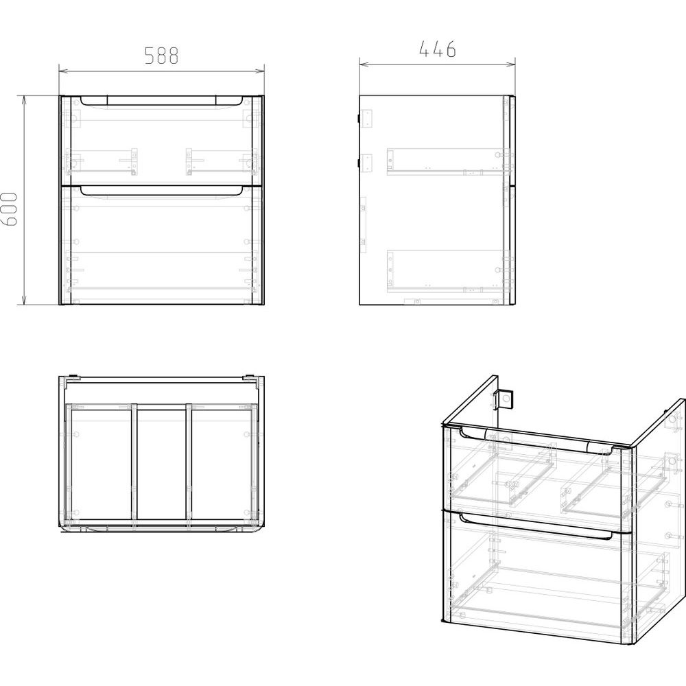 Комплект мебели включает подвесную тумбу размером 58,8x44,6x60 см с механизмом доводчика для плавного закрывания. Корпус выполнен из ламината, фасады из МДФ, покрыты пленкой. В комплекте также раковина STWORKI Adel 60, выполненная из прочного искусственного камня размером 60x45 см, с отверстием под смеситель и слив-переливом в комплекте. Сифон Wirquin Neo из пластика с мокрым затвором, регулируемый по высоте и пропускающий до 57,5 л/мин. Зеркало-шкаф с сенсорной подсветкой и встроенной розеткой, размером 60,2x13,7x80 см.