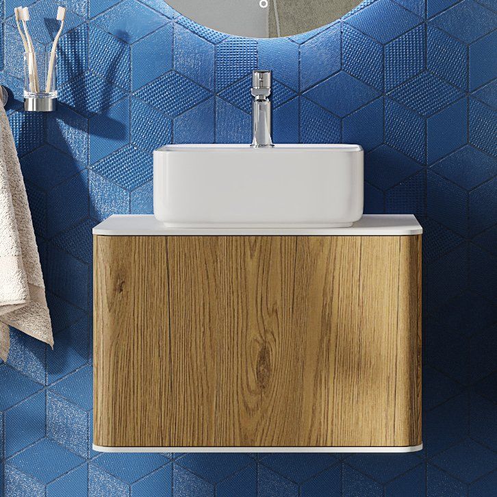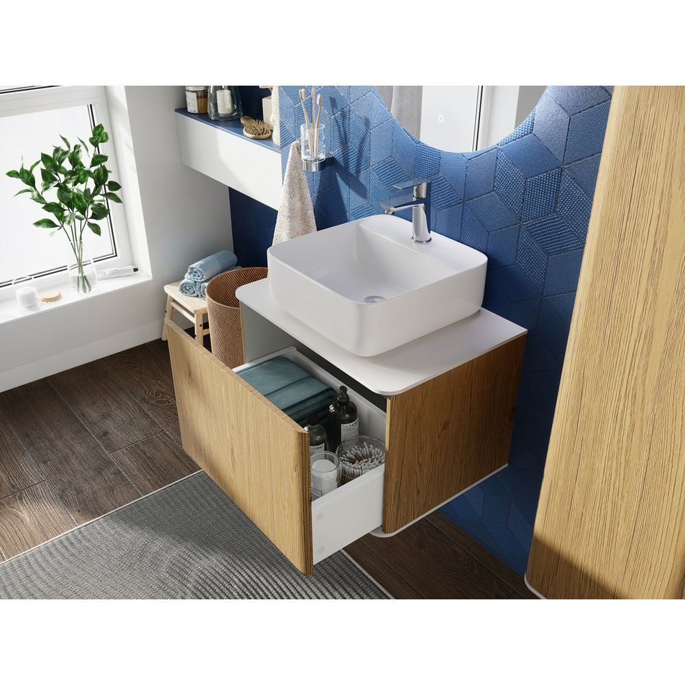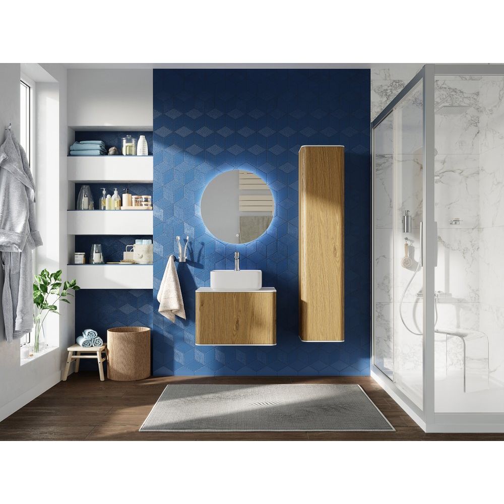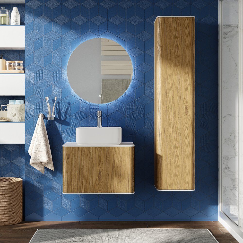 Мебель для ванной комнаты STWORKI из коллекции «Ноттвиль» воплощает скандинавский стиль, где доминируют простота и функциональность. Модель «Ноттвиль 60» в древесном оттенке дуб верона добавляет теплоту интерьеру и создает атмосферу уюта. Подвесная тумба с одним выдвижным ящиком удобно хранит все банные принадлежности. Ящик открывается нажатием, а механизм доводчика обеспечивает плавное закрывание. На столешницу устанавливается белая фарфоровая раковина STWORKI City 2 с грязеотталкивающим покрытием, упрощающим уборку. В набор также входит круглое зеркало с LED-подсветкой и сенсорной кнопкой для лёгкого управления яркостью.