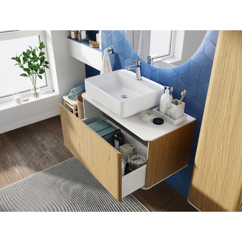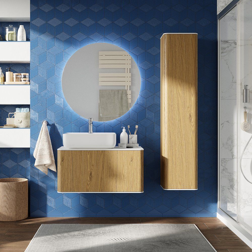 Мебельный гарнитур для ванной комнаты STWORKI «Ноттвиль 80» — это воплощение уюта и современности. Светлый древесный оттенок «дуб верона» создаст теплую атмосферу в вашем интерьере. Подвесная тумба с цельной столешницей из МДФ гармонично дополнена фарфоровой раковиной и круглым зеркалом с LED-подсветкой. Каждый элемент выполнен с акцентом на стиль и функциональность: раковина с антигрязевым покрытием упрощает уход, а на фасадной поверхности тумбы не остаются следы благодаря уникальному механизмам открывания и закрывания.