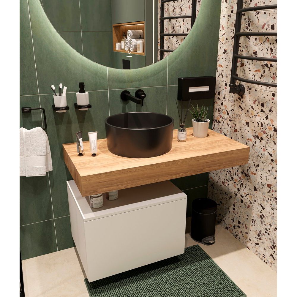 Мебель для ванной STWORKI «Ольборг 100» сочетает в себе практичность и стиль минимализма, привнося уют в интерьер вашей ванной комнаты. Гарнитур включает в себя подвесную белую тумбу с выдвижными ящиками, которые открываются при нажатии на фасад, обеспечивая удобство в использовании. Столешница цвета «дуб французский» выполнена из фанеры с прочным HPL-покрытием, что обеспечивает ей влагостойкость. Черная раковина-чаша Rotenburg 40 из фарфора без отверстий под смеситель оснащена антигрязевой и антибактериальной защитой, что значительно облегчает уход за ней. Гармонично завершает комплект круглое зеркало «Мальмё 100», оснащенное стильной светодиодной подсветкой, управляемой сенсорной кнопкой на поверхности.