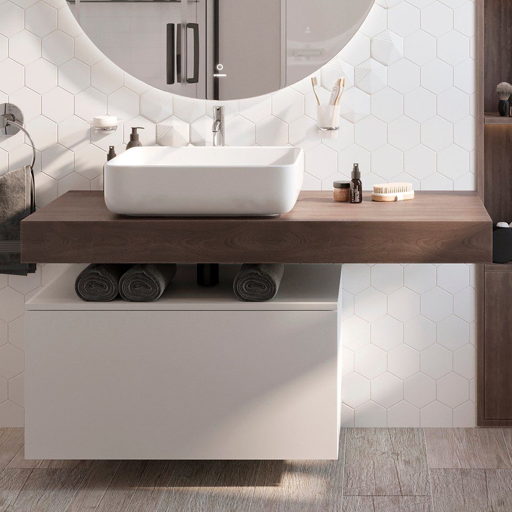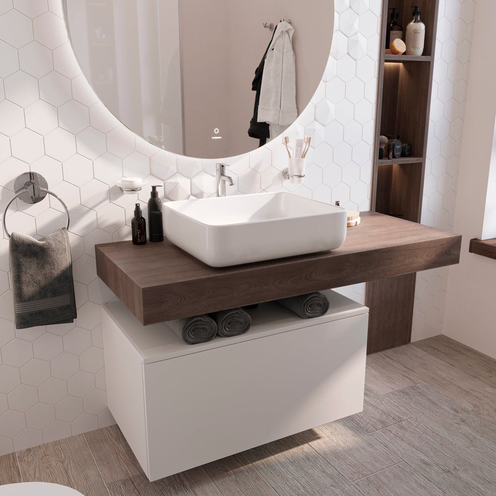Раковина STWORKI Soul 1, изготовленная из фарфора, обладает размерами 50x40 см и подходит для сифона диаметром 3.2 см. Столешница Ольборг 120 из фанеры с покрытием HPL-пластиком выполнена в цвете темное дерево и имеет габариты 120x50x11 см, предлагая гладкую поверхность без отверстий. Подвесная тумба Ольборг 80 с габаритами 80x47.5x40 см выполнена из МДФ с пленочным покрытием. Зеркало Мальмё 100 с ореольной подсветкой и сенсорным управлением гарантирует равномерный свет и имеет габариты 100x2.8x100 см.