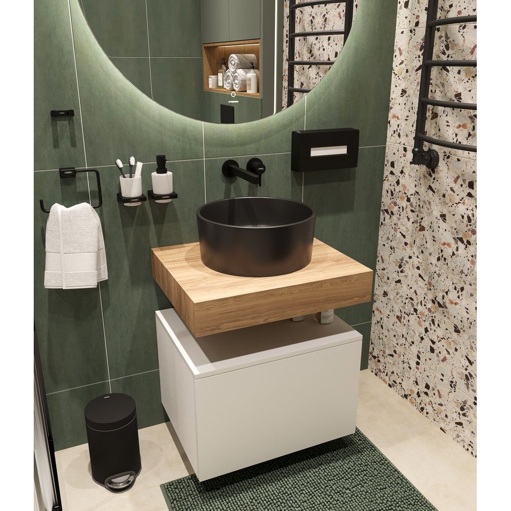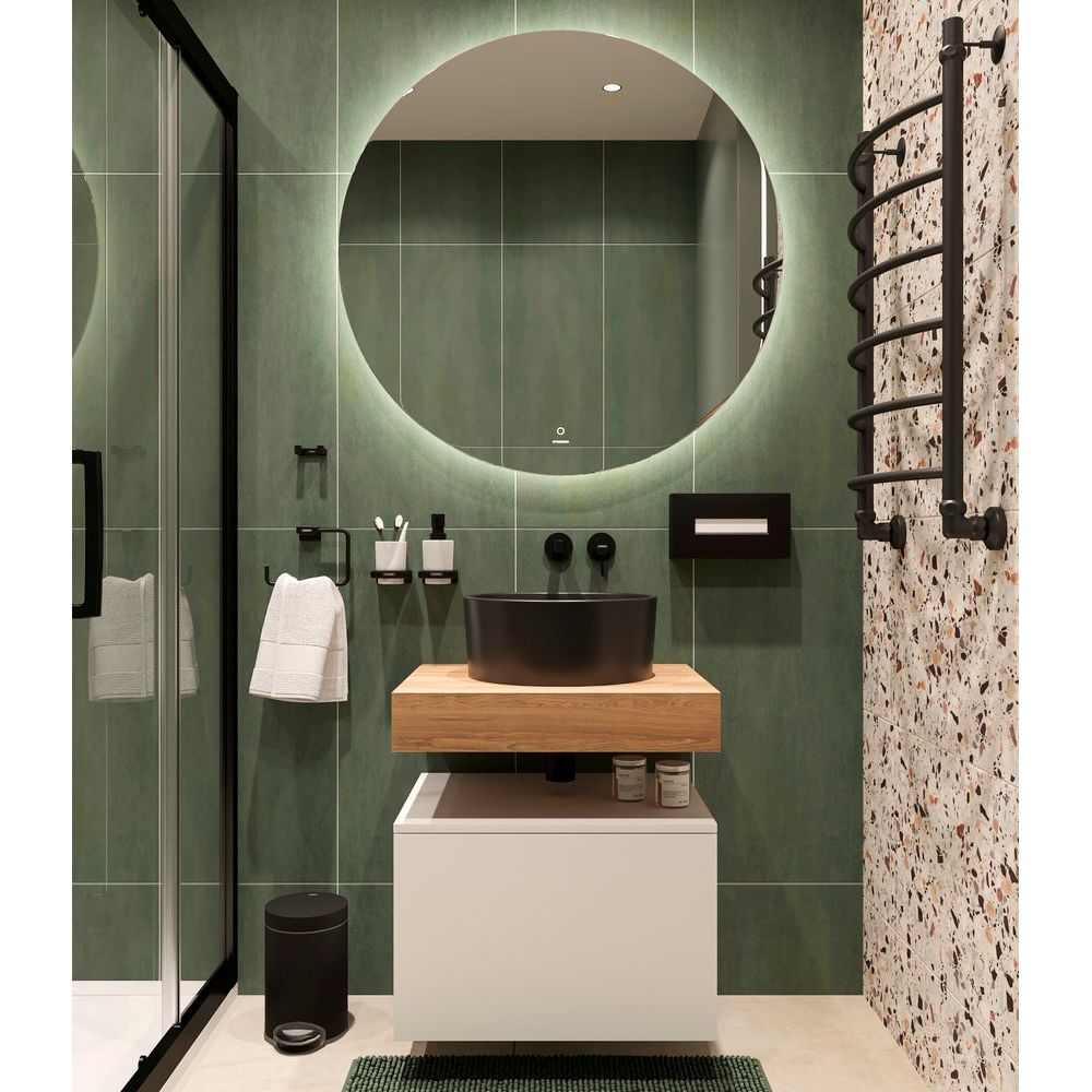 Столешница выполнена из фанеры и покрыта HPL-пластиком, имеет габариты 60x50x11 см и прекрасный оттенок светлого дерева Ольборг. Она поставляется без готовых отверстий под смеситель, что дает вам возможность гармонично интегрировать ее в ваш интерьер. Тумба подвесная, размером 60x47.5x40 см, изготовлена из МДФ и покрыта пленкой, в ней предусмотрены два скрытых выдвижных ящика без механизма доводчика, с нажимным механизмом открывания. Добавлено круглое зеркало STWORKI Мальмё 100 с встроенной подсветкой, которая регулируется сенсорным выключателем, и с эстетичными и безопасными краями благодаря еврокромке.