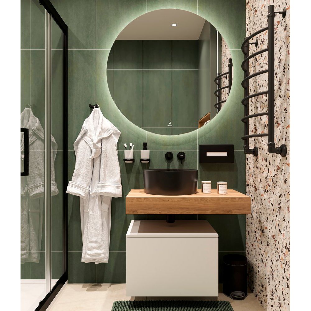 - Удобство использования: нажимной механизм открывания тумбы и сенсорное управление подсветкой зеркала.