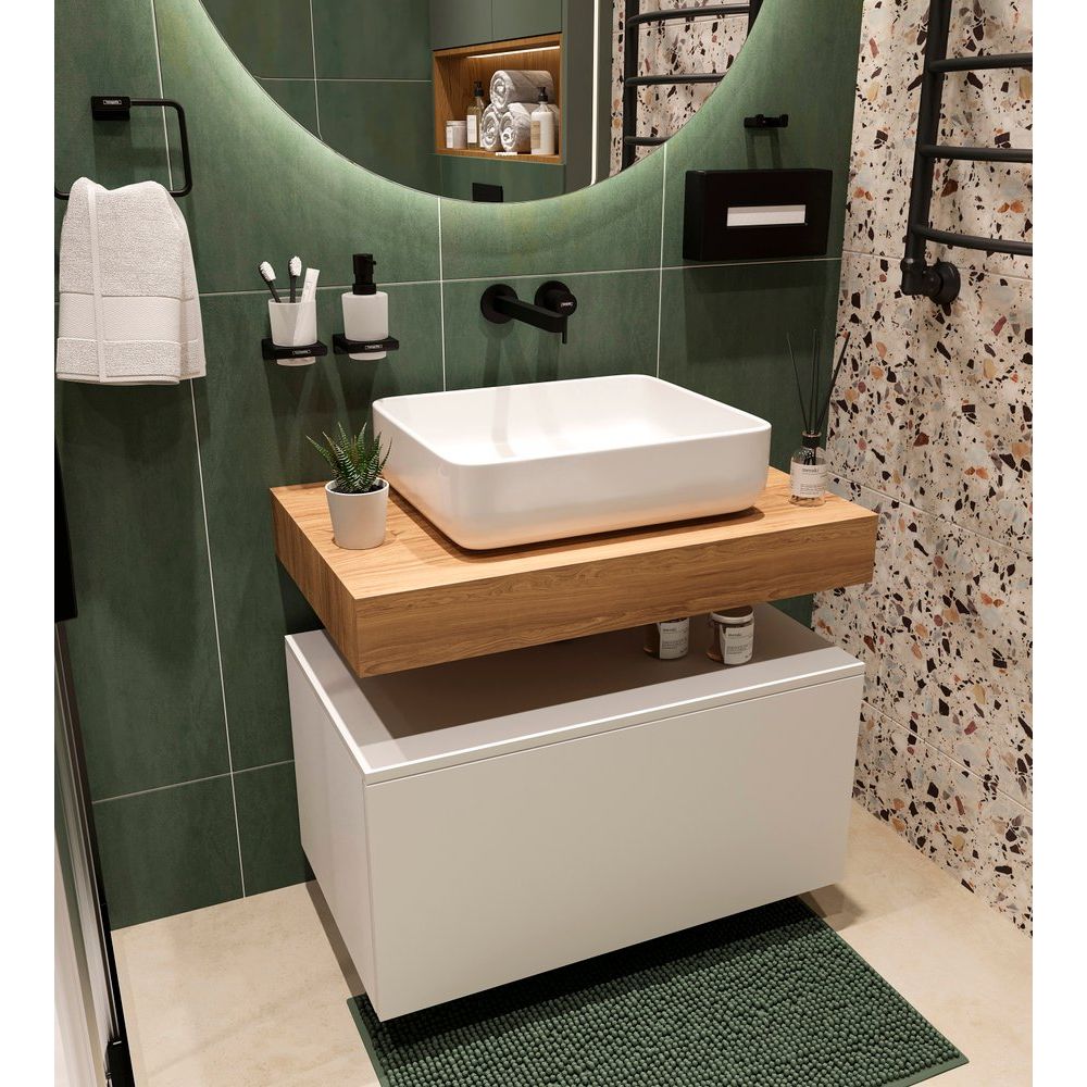 Мебель для ванной STWORKI «Ольборг 80» – это идеальное решение для тех, кто ценит комфорт и элегантность. Данный гарнитур поможет создать расслабляющую атмосферу в вашем санузле, сочетая простоту форм с современным дизайном. Белая тумба из МДФ с двумя выдвижными ящиками обладает удобной подвесной конструкцией, а нижний ящик оснащен органайзером для четкого разделения пространства. Благодаря нажимному механизму фасады открываются при легком прикосновении. Надежная раковина из фарфора «STWORKI Soul 1» располагается на влагостойкой столешнице с HPL-покрытием, обеспечивая простоту ухода и защиту от грязи. Настенное зеркало «Мальмё 100» с LED-подсветкой украсит любой интерьер, предоставляя возможность регулировки освещения через сенсорный выключатель.