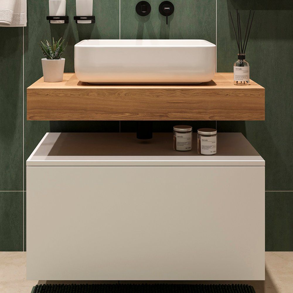 - Столешница из фанеры с HPL-пластиком: 80x50x11 см, без отверстий под смеситель, цвет 'светлое дерево Ольборг'.