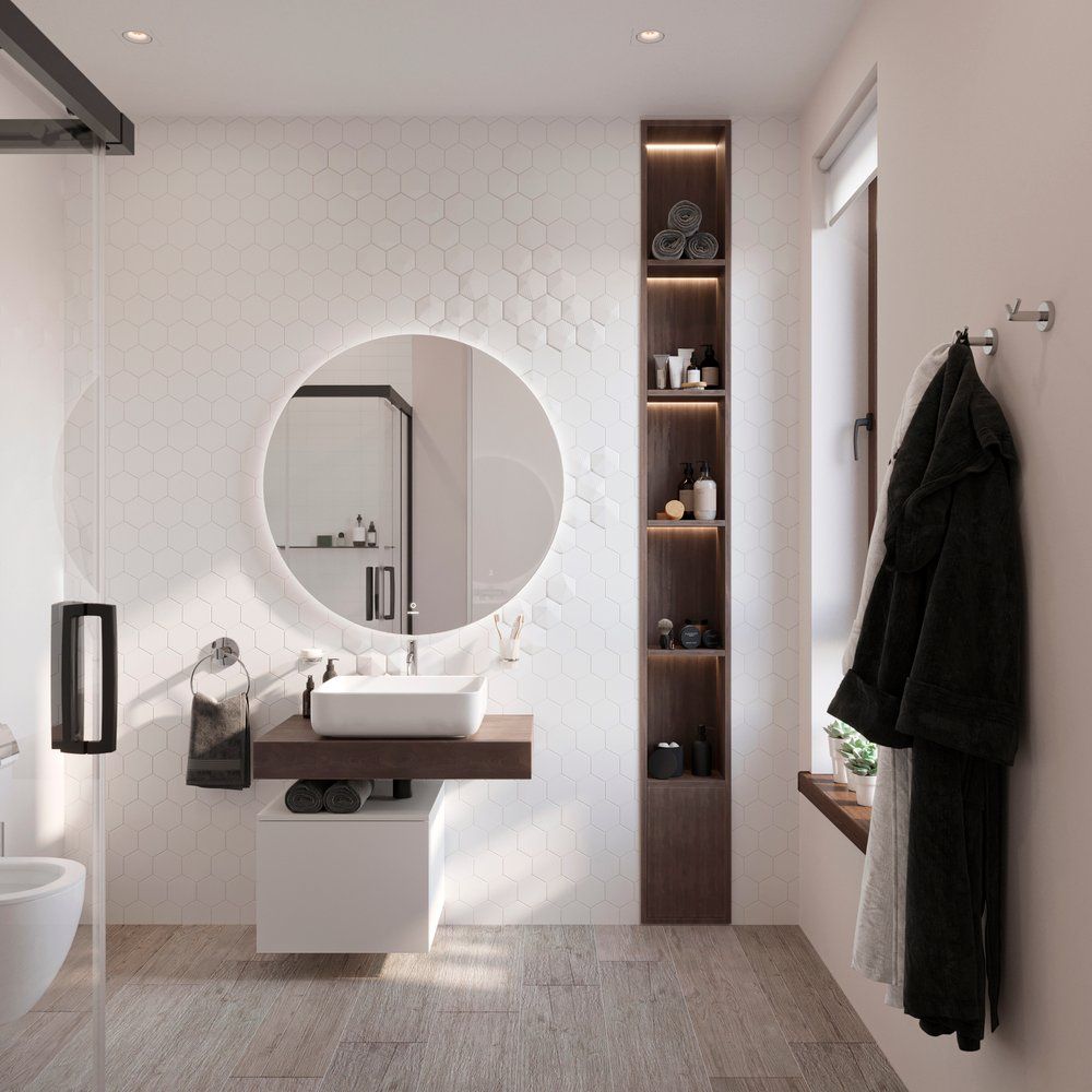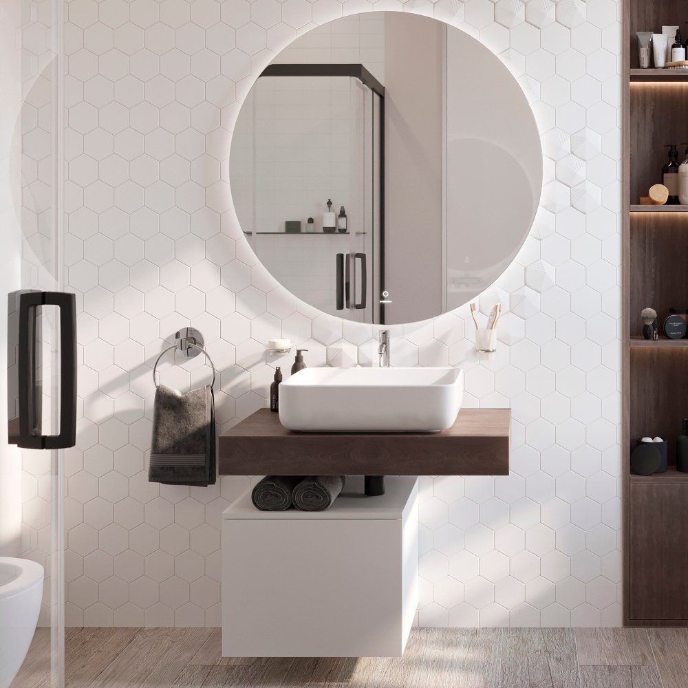 - Круглое зеркало с ореольной подсветкой и сенсорным управлением добавляет современности.