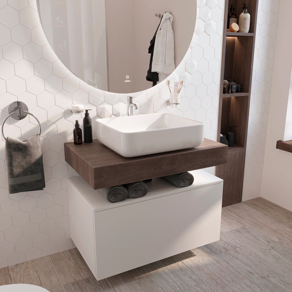 Мебельная раковина STWORKI Soul 1 размерами 50x40 см изготовлена из качественного фарфора. Она рассчитана на сифон диаметром 3,2 см. Столешница из фанеры в темном цвете "Ольборг" имеет размеры 80x50x11 см. Тумба изготовлена из МДФ с пленочным покрытием, ее размеры составляют 80x47.5x40 см, а конструкция подвесного типа добавляет легкости в дизайн ванной комнаты. Зеркало диаметром 100 см с пластиковой рамой имеет ореольную подсветку с сенсорным управлением, что делает его идеальным элементом для современных интерьеров.