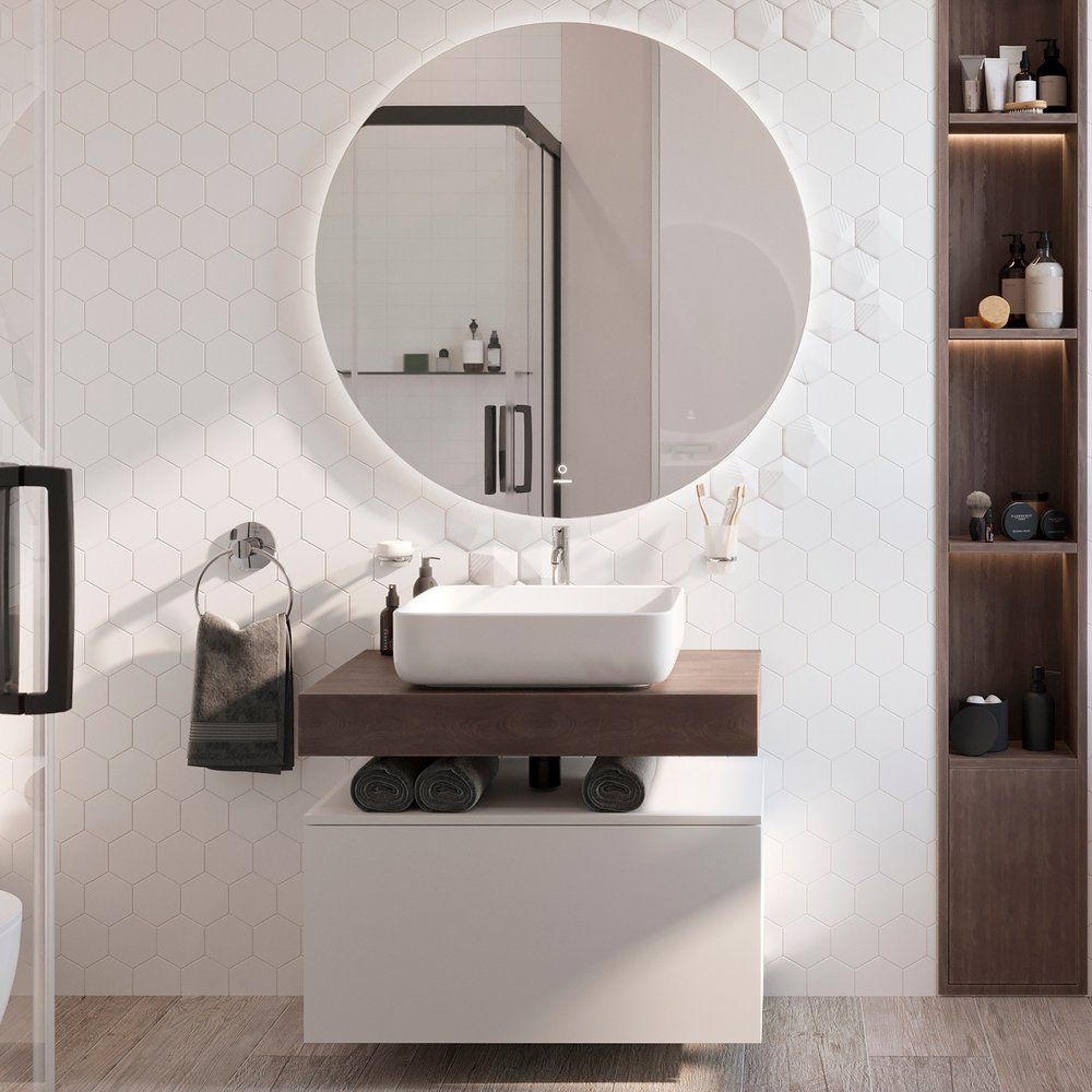 - Круглое зеркало с ореольной подсветкой и сенсорным управлением добавляет изысканности в любой интерьер.