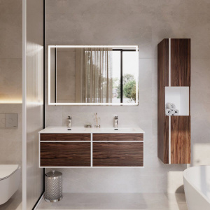 В состав комплекта входит стильная подвесная тумба из ЛДСП с белоснежной фурнитурой, размером 59,7x45,8x39,2 см. Все ящики оснащены механизмом доводчика для максимально плавного закрытия, что обеспечивает приятное использование и долговечность. Двойная раковина из фаянса размером 120x46,5 см оснащена встроенным сливом-переливом и двумя отверстиями под смеситель. Современное настенное зеркало с подсветкой от AGC, размером 120x3x80 см, легко управляется сенсорным выключателем и подходит даже для высоких людей благодаря своей форме и размерам. Все элементы произведены в России и имеют гарантии от 2 до 5 лет.