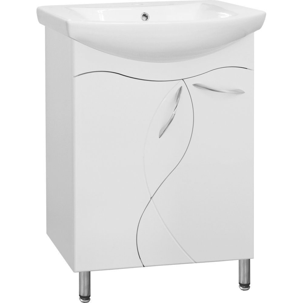 - Тумба: габариты 60,5x31,8x85 см с напольной установкой, выполнена из ламината ЛДСП с фасадами из МДФ и пленкой.