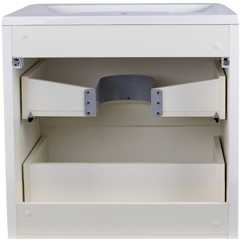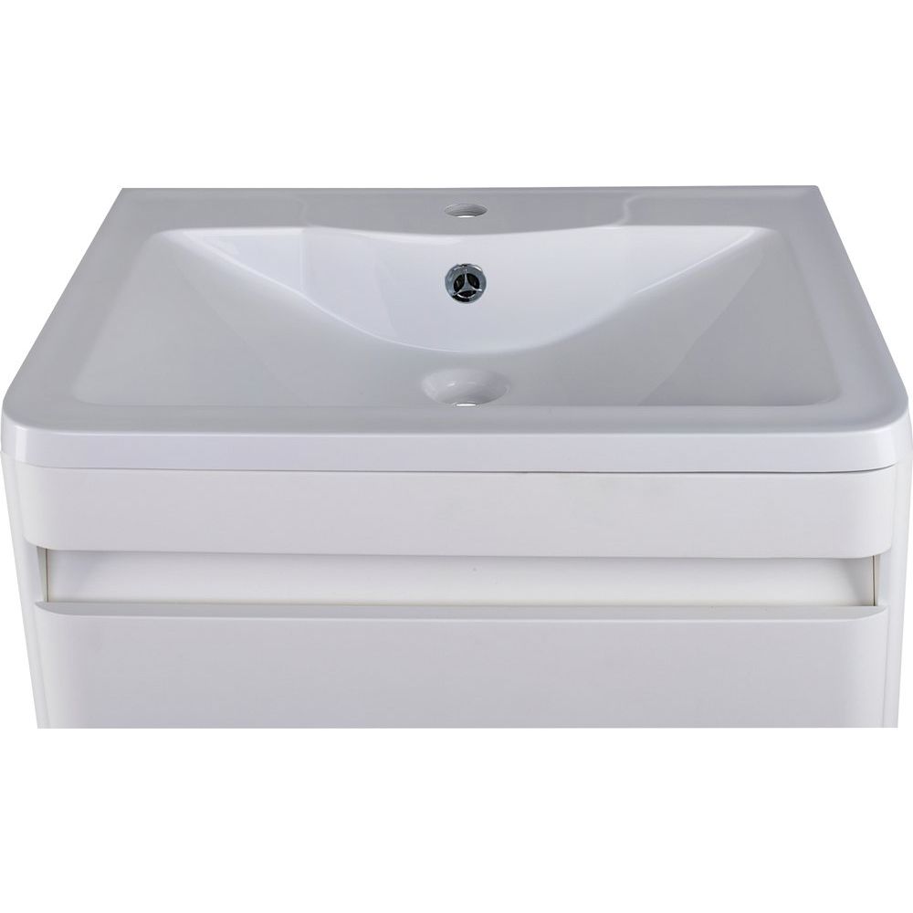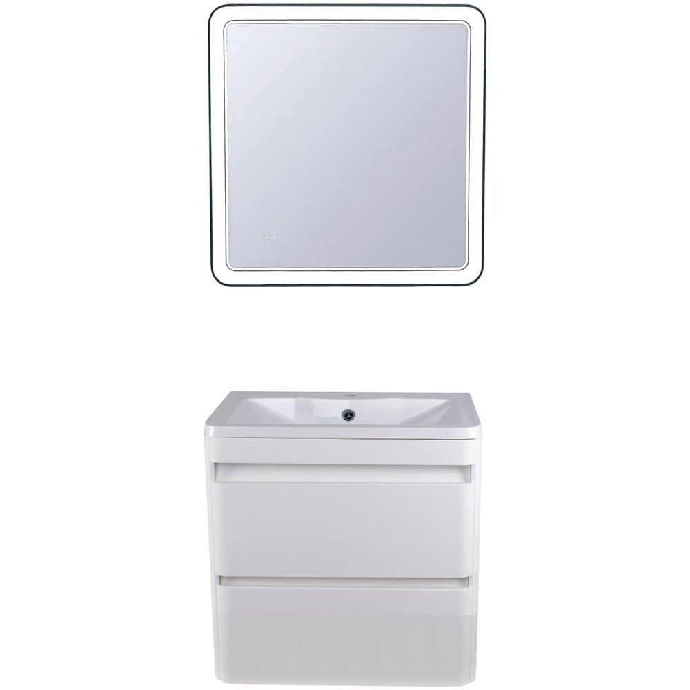 Подвесная тумба для комплекта имеет размеры 60х45х59 см, что позволяет органично вписаться в интерьер даже небольших ванных комнат. Используемый МДФ в качестве материала корпуса и фасада покрыт пленкой, защищающей от влаги и механических повреждений. Доводчики обеспечивают каждый ящик мягким закрытием. Раковина из искусственного мрамора, шириной и глубиной 60 на 45 см, оснащена сливом-переливом, и имеет одно отверстие под смеситель. Зеркало в комплекте оснащено сенсорной подсветкой и часами, а его размеры составляют 60х2,7х60 см. Для удобства монтажа изделие также обеспечивает подвес.