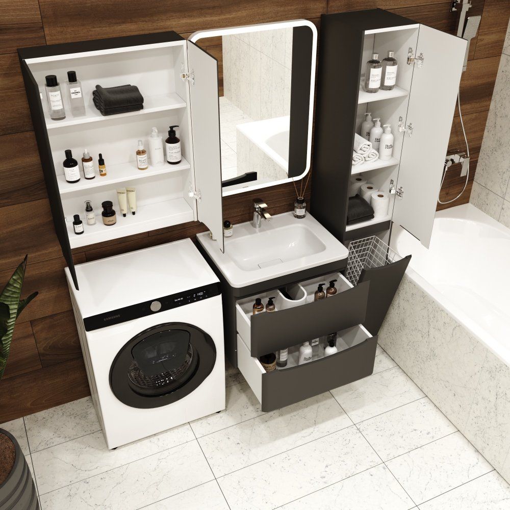 - Комплектация, включающая тумбу, мебельную раковину и зеркало с подсветкой и часами