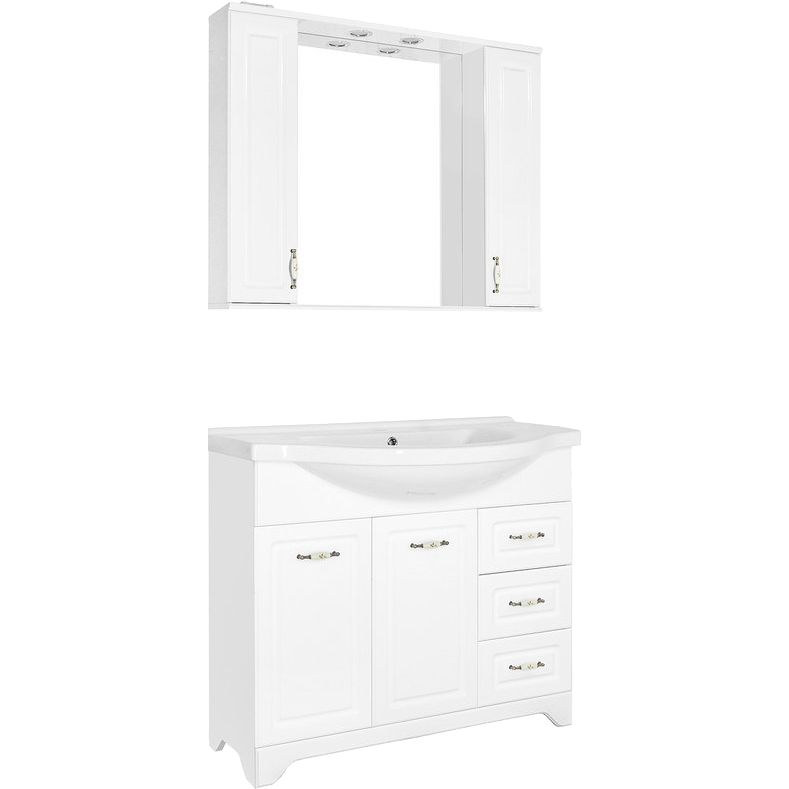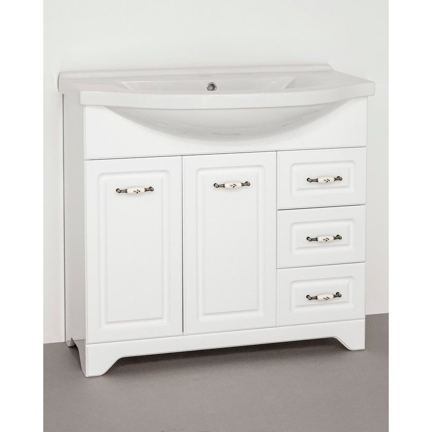 - Тумба: Габариты 96x33,5x85 см. Выполнена из МДФ с покрытием из пленки. Оснащена механизмом доводчика для плавного закрывания. Напольная, с белой и бронзовой фурнитурой. Гарантия 1 год. Производство — Россия.
